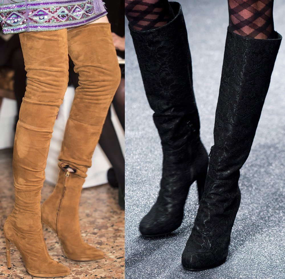 Les bottes en daim d'actualité et un talon stable sont d'un style impeccable, tandis que les cuissardes sont une proclamation de la féminité.