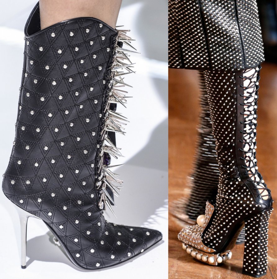 Le matériau le plus en vogue pour les bottes sera le daim, le cuir mat et verni reste d'actualité. Il existe également des bottes entièrement en fourrure. En ce qui concerne le daim et la fourrure, vous devez supposer ici qu'en plus d'eux, vous devrez acheter une paire supplémentaire ou, plus simplement, des bottes en caoutchouc. En Russie, le temps est changeant et, malgré un temps froid prolongé, de fortes fluctuations de température se produisent pendant la période automne-hiver. Par conséquent, vous devez souvent écouter les rapports des météorologues afin que vos bottes en daim préférées ne soient pas mouillées. Comme toujours, une option luxueuse est les bottes en cuir de crocodile. La peau de python reste également d'actualité. Les imitations de peau de crocodile et de python, ainsi que les versions combinées de modèles de divers matériaux, sont très pertinentes à l'automne et à l'hiver 2025-2026.