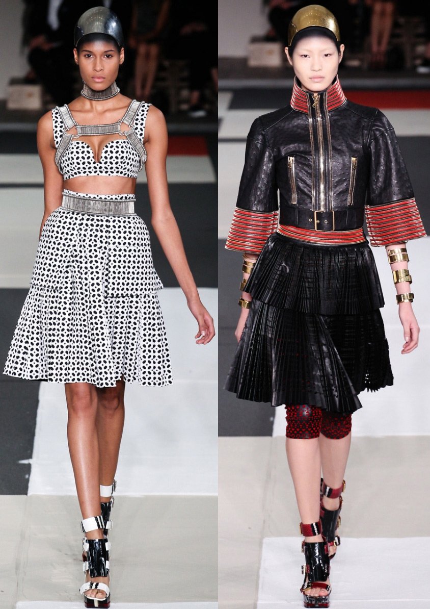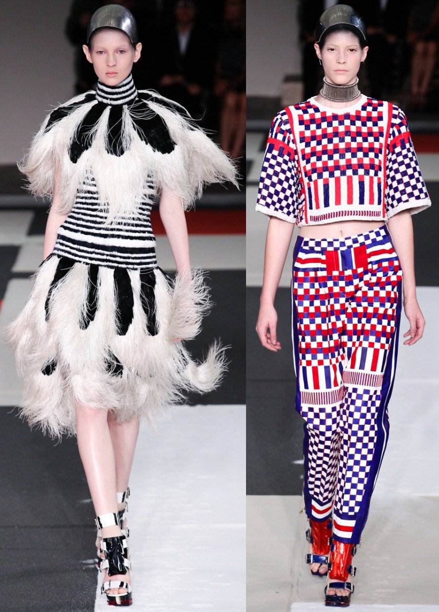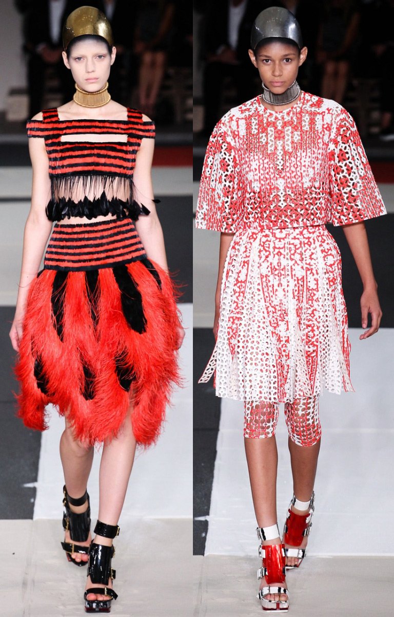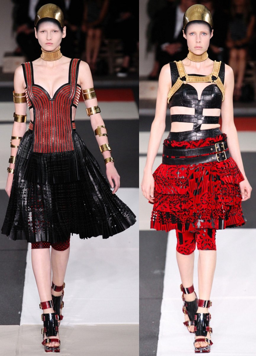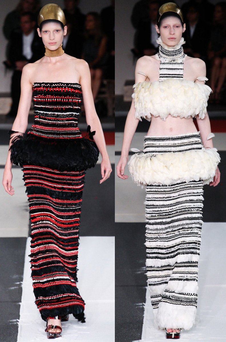 Tous les vêtements Alexander McQueen ont une coupe parfaite, une attitude respectueuse envers la beauté - y compris les jeans qu'il a inventés qui glissent jusqu'aux hanches, les vestes kimono avec une taille accentuée, les robes avec corsets en cuir rugueux, les robes Art déco, les capes-capes à capuche et bien d'autres autres choses. Il travaillait autrefois dans des ateliers de théâtre, et aimait donc présenter sa collection sous forme de scénographie avec effets spéciaux. Les vêtements d'Alexander McQueen reflètent les hautes traditions de l'art du design, ils contiennent non seulement de la beauté, mais aussi de nouvelles sensations de la vie.