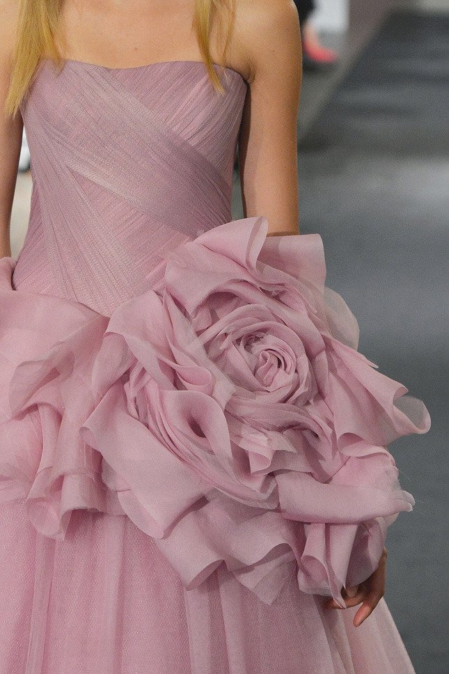 Malgré les choix de couleurs légèrement non conventionnels, les robes Vera Wang sont toujours des robes de mariée, et cela peut être vu dans des robes de bal duveteuses composées de couches de tissu transparent aéré, d'un corset séduisant, de roses luxueuses, d'arcs et d'autres éléments de coupe et de décoration.