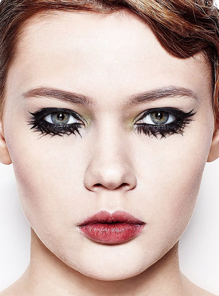 Le bord inférieur des cils est dessiné par pression avec du kayal noir, et un liner gel est appliqué entre les cils et ombré.