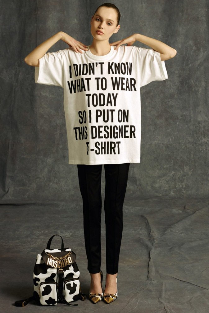 Les sacs et sacs à dos à la mode sous forme de vêtements, les t-shirts avec des inscriptions ironiques seront certainement très demandés. Et les fans les plus épris de la maison de couture aimeront sûrement l'idée de porter plusieurs sacs Moschino à la fois. Si vous aimez choquer le public, et décidez généralement très audacieusement d'expérimenter pour impressionner, vous pouvez emprunter l'idée de porter une chemise de nuit par-dessus un trench-coat, car la mode peut être amusante et avoir des manifestations frivoles.