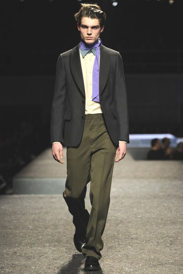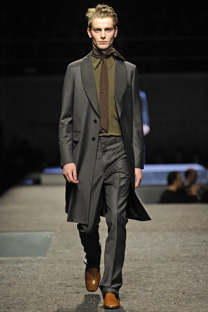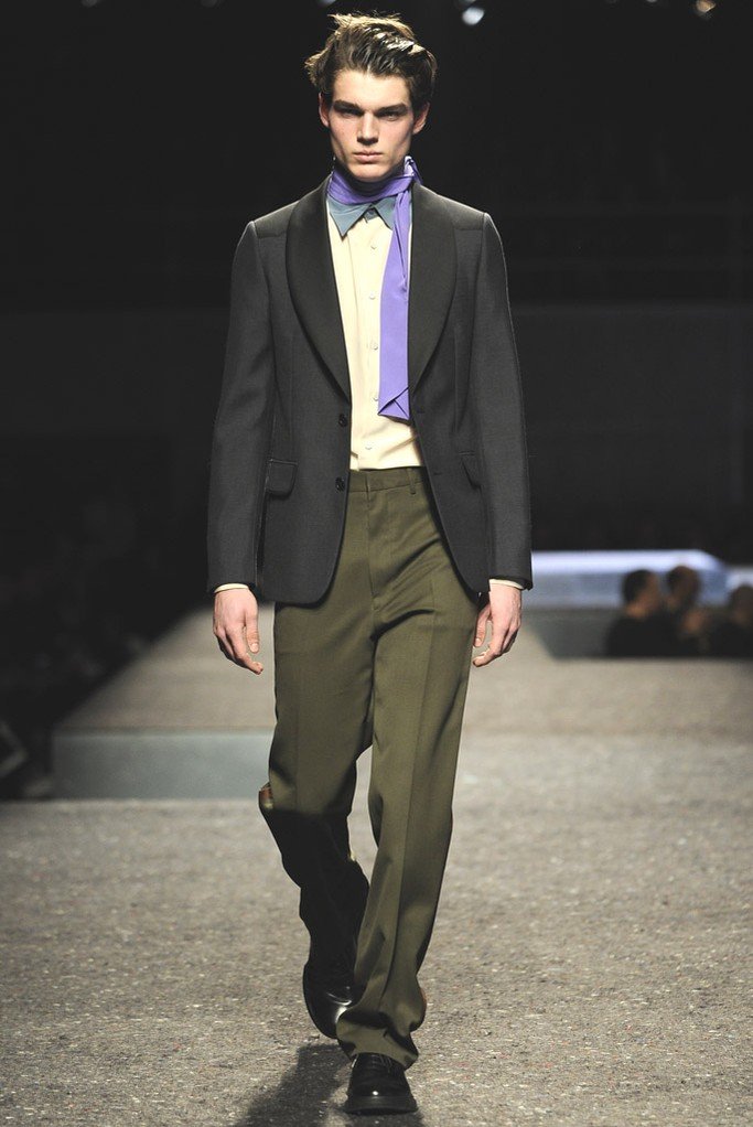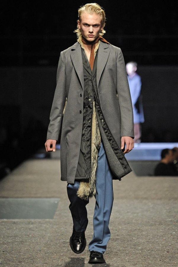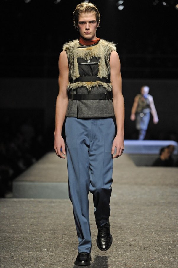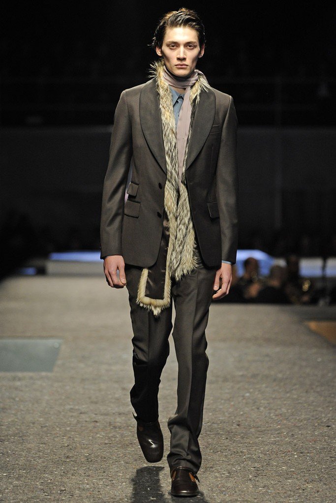 En plus des costumes traditionnels, l'homme Prada portera des gilets en fourrure et des manteaux matelassés sans col pour l'hiver 2025-2026. Normalement Miuccia Prada prêté attention aux détails, ne faisant pas de liens sur le cou des modèles de manière traditionnelle, mais simplement en les nouant sur le côté.
