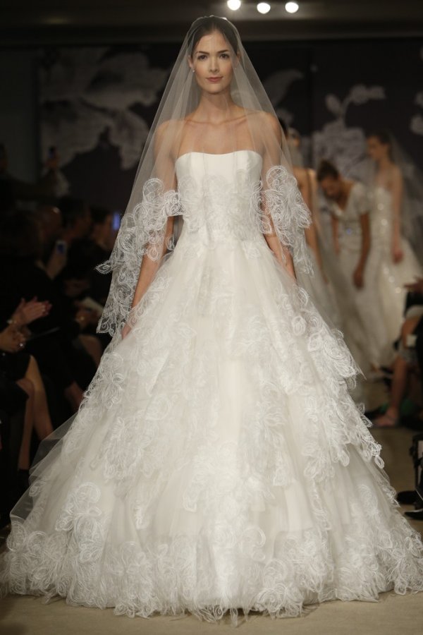 La nouvelle collection de robes de mariée de Carolina Herrera pour le printemps 2026 est réalisée de manière très traditionnelle - partout du blanc, de la dentelle, des fleurs, des cristaux scintillants, de la broderie. De nombreuses robes ont des jupes bouffantes et des bustiers.