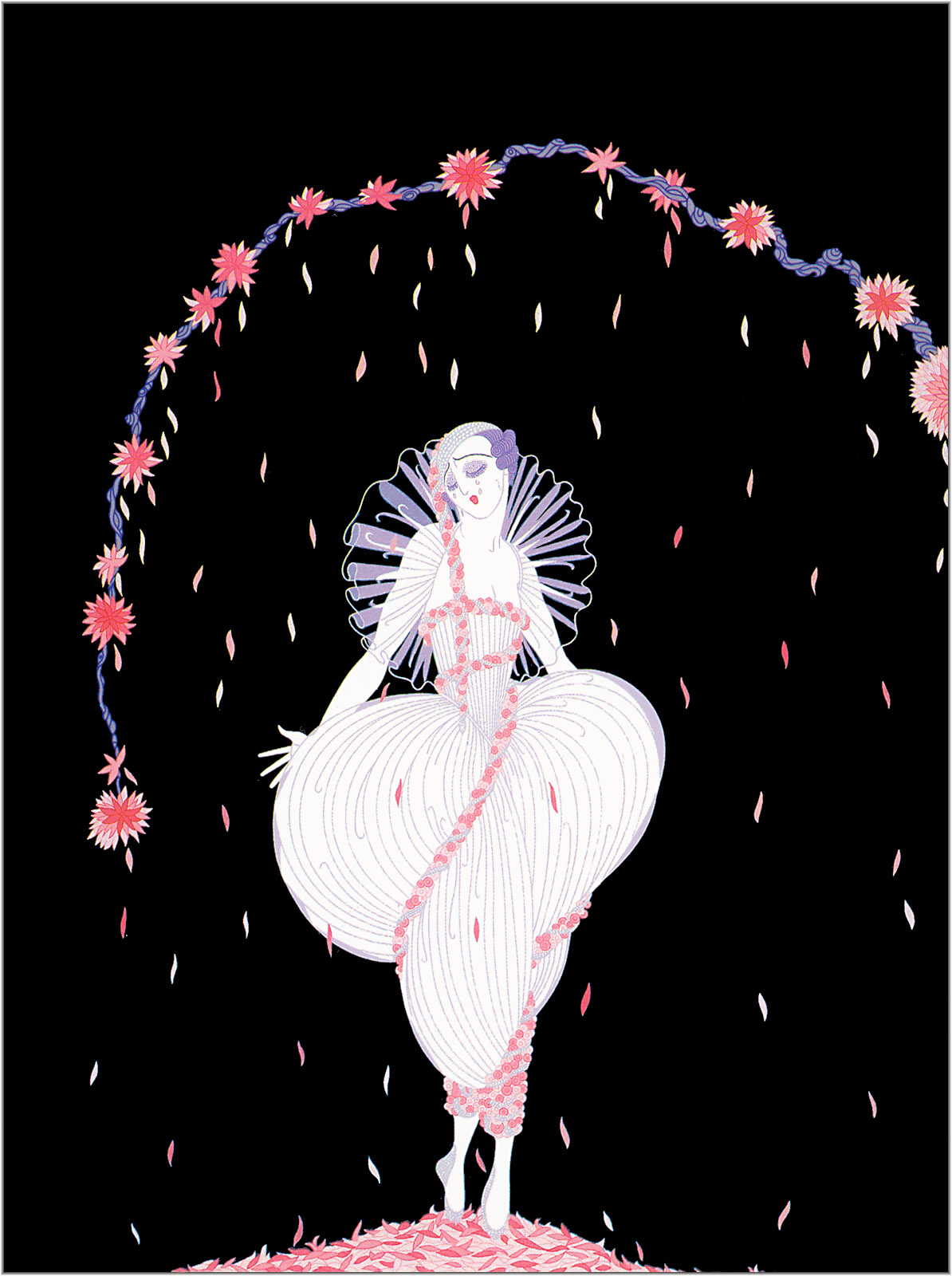 Dans les années 20 et 30, Erte a travaillé en Amérique à l'Opéra de Chicago. La valeur de son travail a été très appréciée. Les œuvres d'Erte ont connu un grand succès dans les compagnies d'opéra, de théâtre et de ballet à Paris, New York, Monte Carlo, Chicago. Erte a dessiné des croquis et créé des costumes pour Actrices hollywoodiennes film muet. Ici, dans cette œuvre, l'esprit de la mode parisienne et du ballet russe, ainsi que des revues pop, se reflète. Son travail cinématographique a également influencé d'autres créateurs de costumes. Erte a créé des croquis en utilisant uniquement ses propres idées. Ses images sont nées sous l'influence de la mythologie grecque et égyptienne antique, des miniatures indiennes et de l'art classique russe. Il ne reconnaissait pas les images de femmes avec des jupes courtes, une silhouette droite, typique des années 20. Erte a créé une robe avec un décolleté asymétrique en 1921.