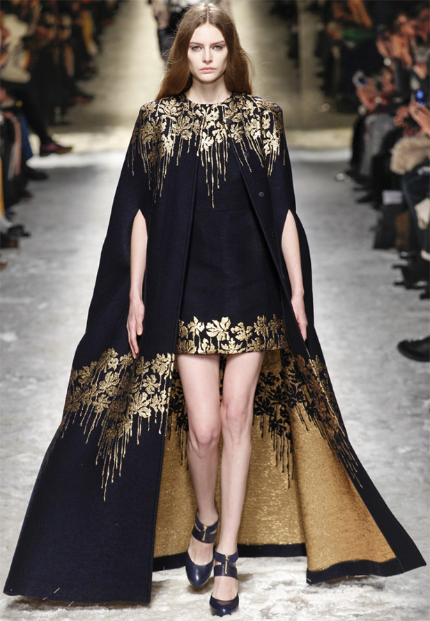 La robe noire et la tenue noire terne sont complétées par des motifs dorés.