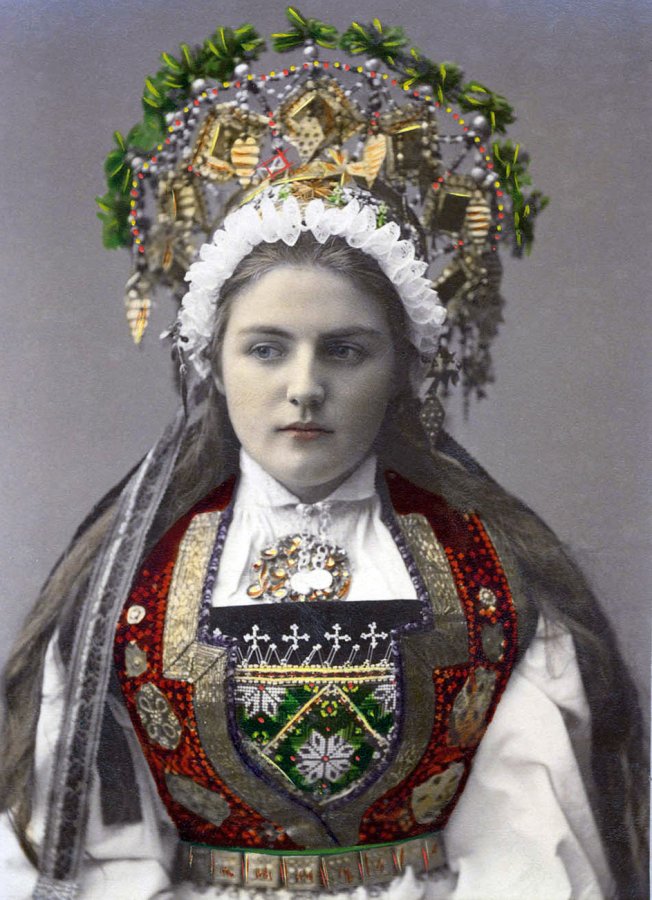 Le costume national norvégien et surtout les robes de mariée des mariées norvégiennes sont également magnifiques, et les précieuses couronnes rappellent un peu nos kokoshniks.