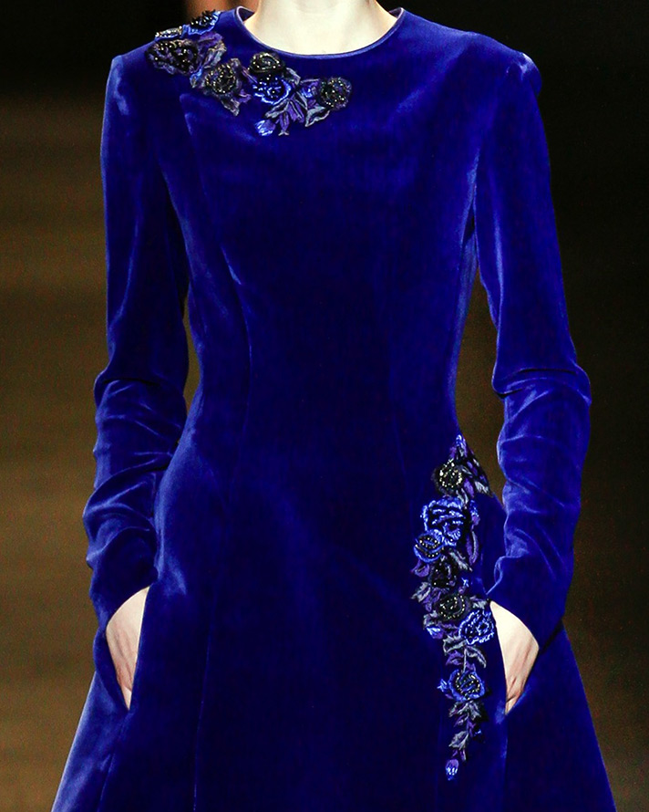 Le velours est un tissu luxueux, velours gaufré, « creusé », matelassé, cloquet... A côté du velours royal apparaissent des tissus élastiques et relativement lourds qui gardent librement leur forme - taffetas, brocart, tissu jacquard, matlassé. En jacquards et matlasse, la brillance souligne le relief du motif.