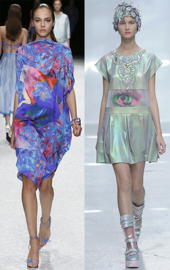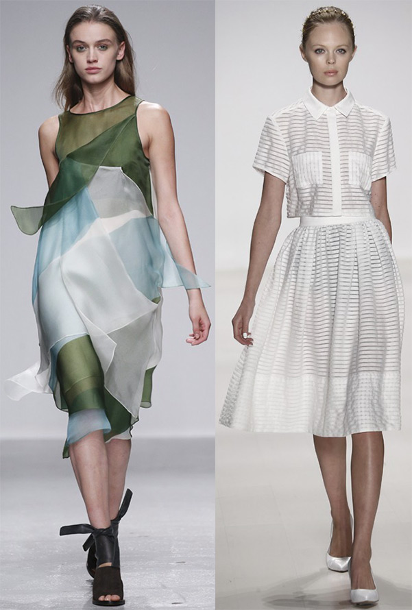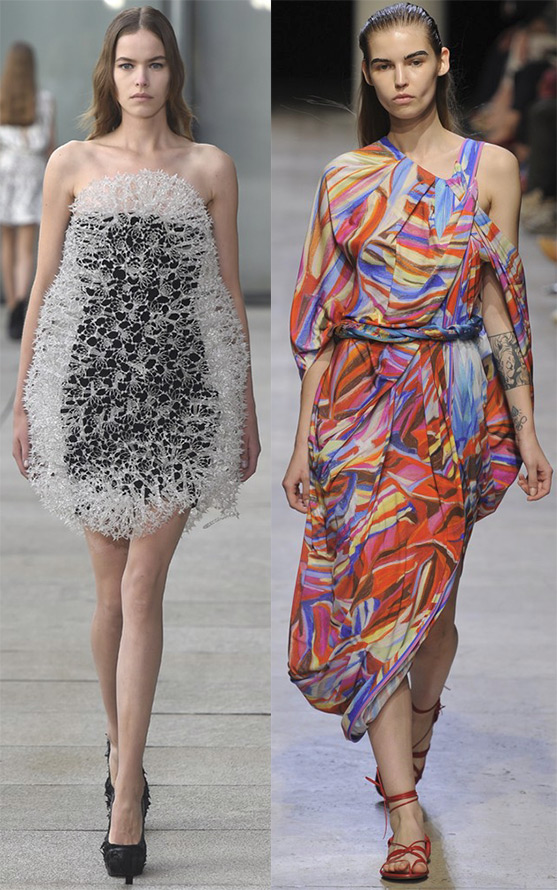 Certains concepteurs ont préféré s'éloigner des imprimés complexes et complexes qui se superposaient et ont adopté une position plus simple pour exprimer leur imagination, mais non moins lumineuse, se définissant dans une combinaison contrastée de blocs de couleurs de formes géométriques sobres et larges. Même la célèbre reine des imprimés Mary Katrantzou a opté pour des imprimés sobres, et dans certaines versions, la monotonie classique.