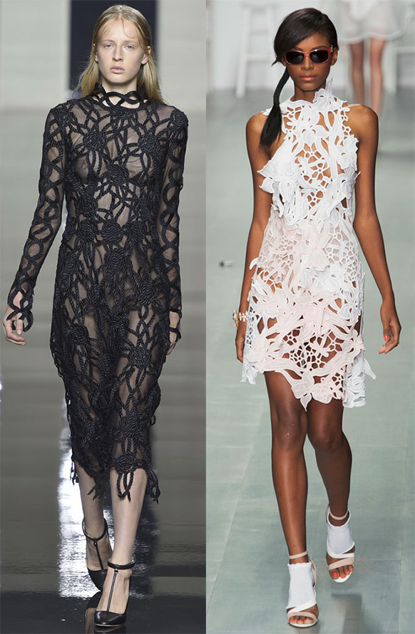 Le filet est fin et le filet est fait de fils torsadés grossiers, rappelant les tissages de macramé ou de jute. La maille ambiguë révèle et cache, elle attire et attire. Broderies Richelieu, broderies au point bourdon, broderies d'ornements nationaux, robes à cols blancs. Fleurs volumineuses qui couvrent presque toute la toile avec leurs brindilles violettes ou leurs fleurs en conjonction avec des plumes.