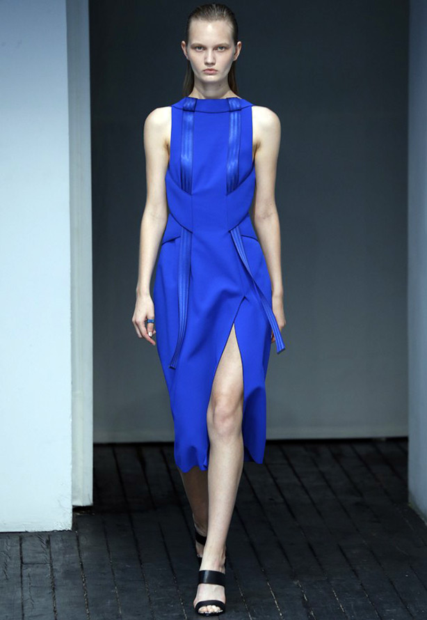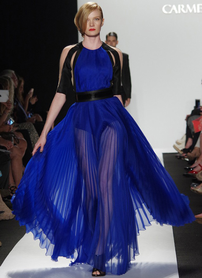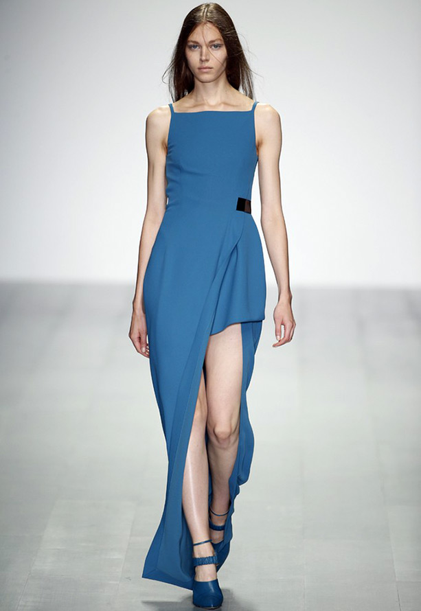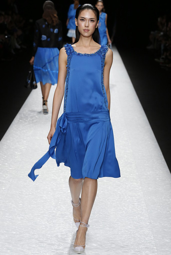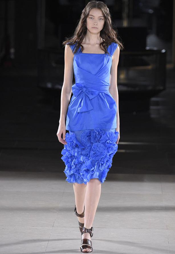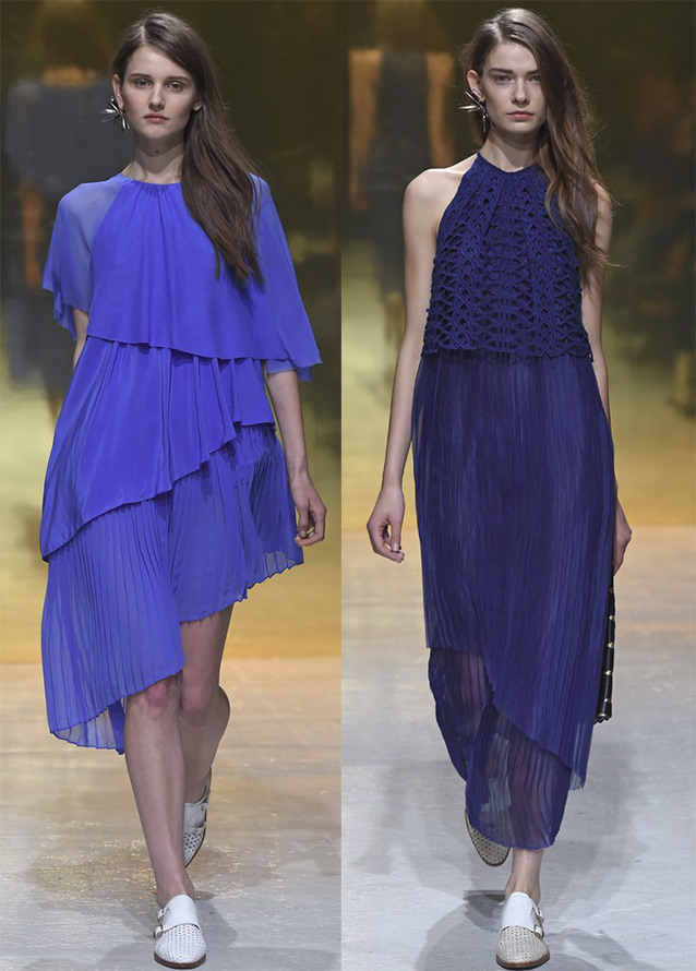 Et Alberta Ferretti, Alexis Mabille, Jenny Packham proposent des robes bleues délicates, car le bleu est essentiellement le même bleu, du fait que le bleu n'est pas la couleur principale ni même intermédiaire. Le cyan est une nuance de bleu qui s'estompe progressivement en nuances d'autres couleurs.