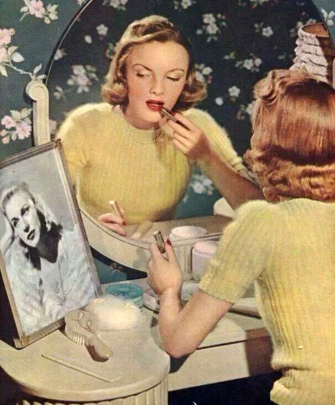 Maquillage des années 1940 - sourcils épilés, pommettes accentuées et rouge à lèvres rouge vif.