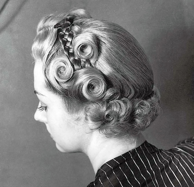 Pendant les années de guerre, les femmes portaient coupes de cheveux courtes, coiffures faites de cheveux mi-longs, dont les extrémités sont recourbées vers l'intérieur. Et aussi des coiffures avec des rouleaux - les rouleaux dans de telles coiffures étaient posés sur les côtés de la séparation droite ou latérale.