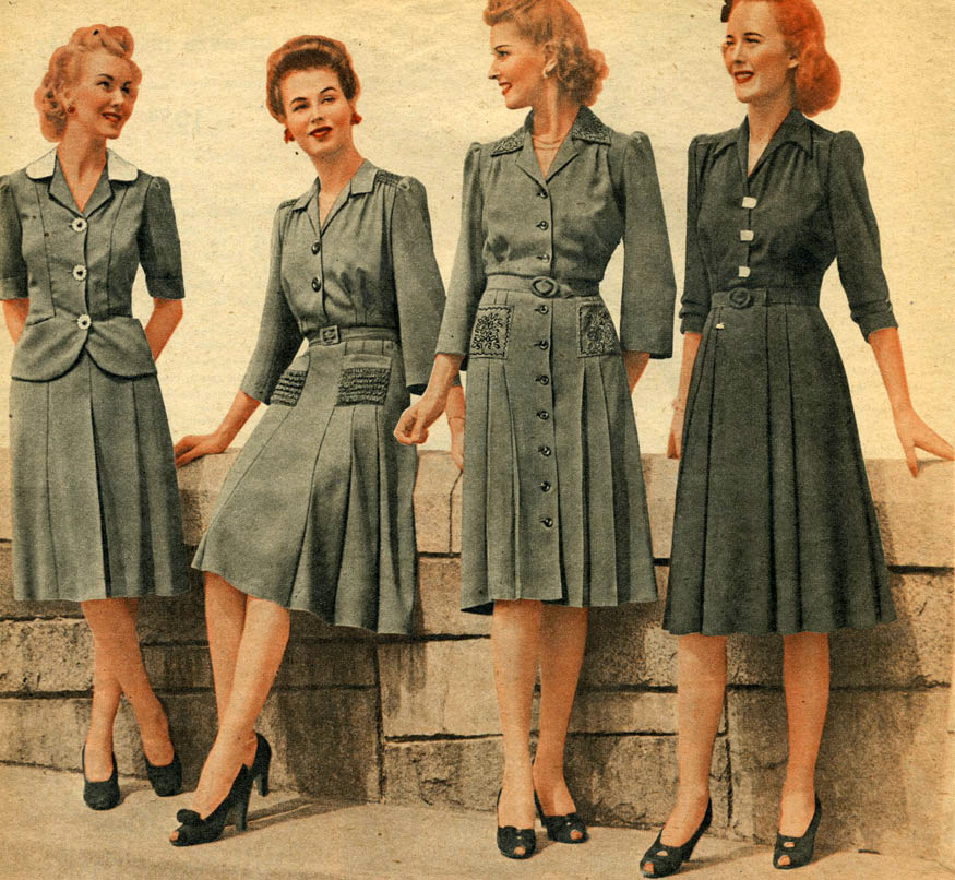 La silhouette des années 1940 est une taille et des hanches serrées, mais avec de larges épaules carrées (comme un uniforme militaire). Les robes, les pulls et les manteaux étaient également portés avec de larges épaules.
