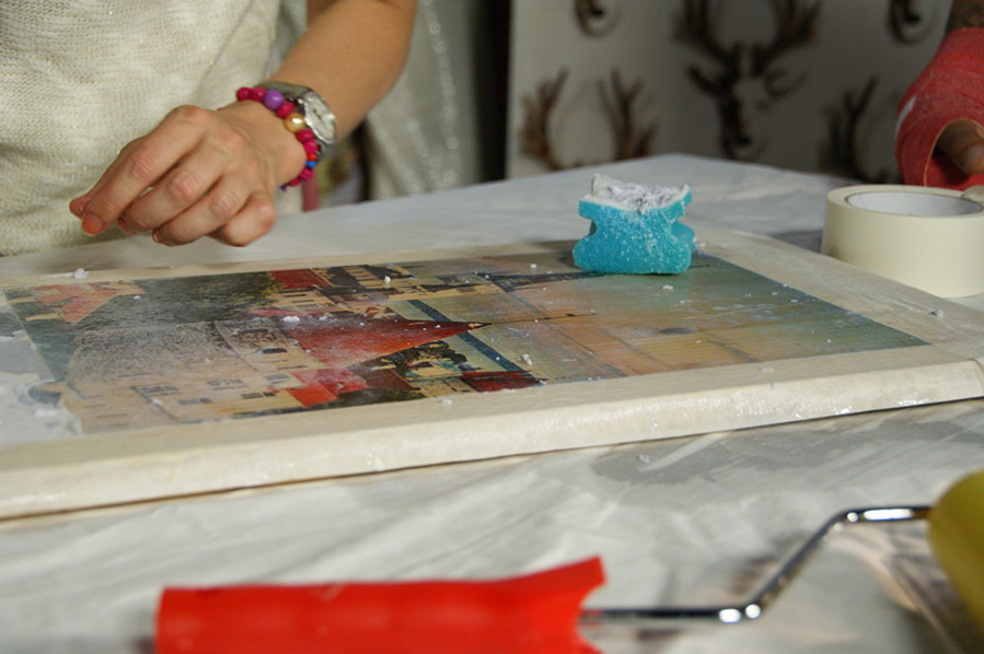 Ensuite, avec une colle spéciale pour transférer des images sur du bois (colle de transfert), nous enduisons abondamment la surface du tableau et saturons également l'image du côté où le dessin est imprimé, et collons soigneusement et uniformément l'image sur la base en bois .