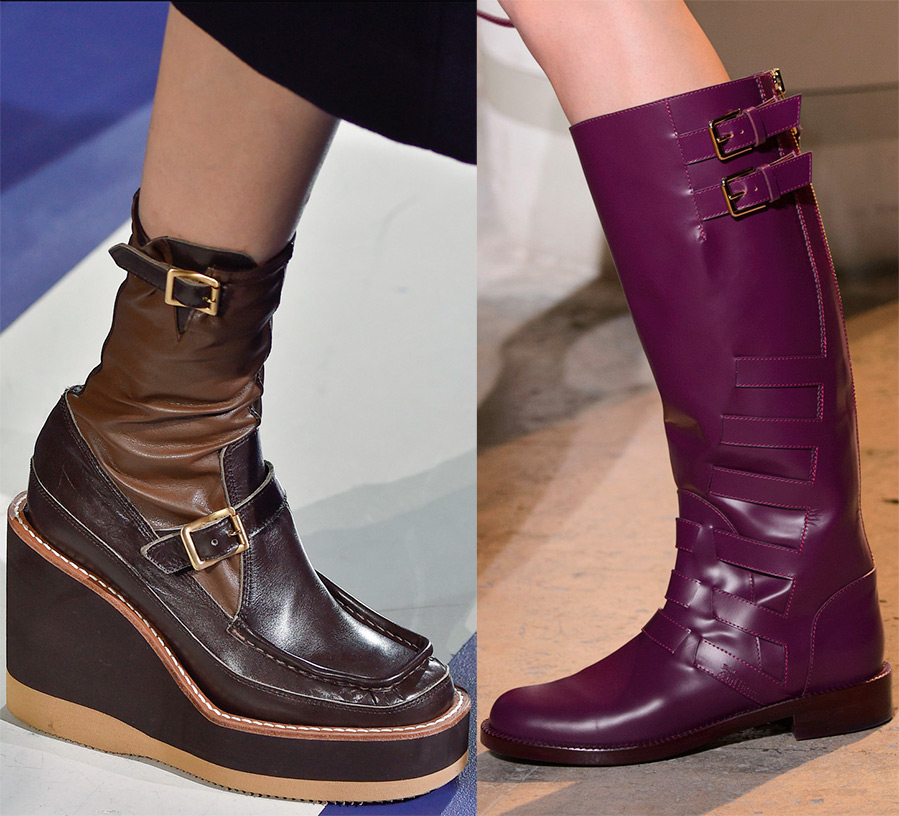 La plate-forme haute dans l'orteil de la chaussure équilibre talon haut, qui peut être une épingle à cheveux ou un poteau éternel. Vous pouvez voir une grande plate-forme solide double ou empilée. Les designers Antonio Marras et Alexander Wang l'ont sérieusement démontré sur le podium. Les talons hauts et les talons larges étaient préférés par Marc Jacobs et Mulberry.