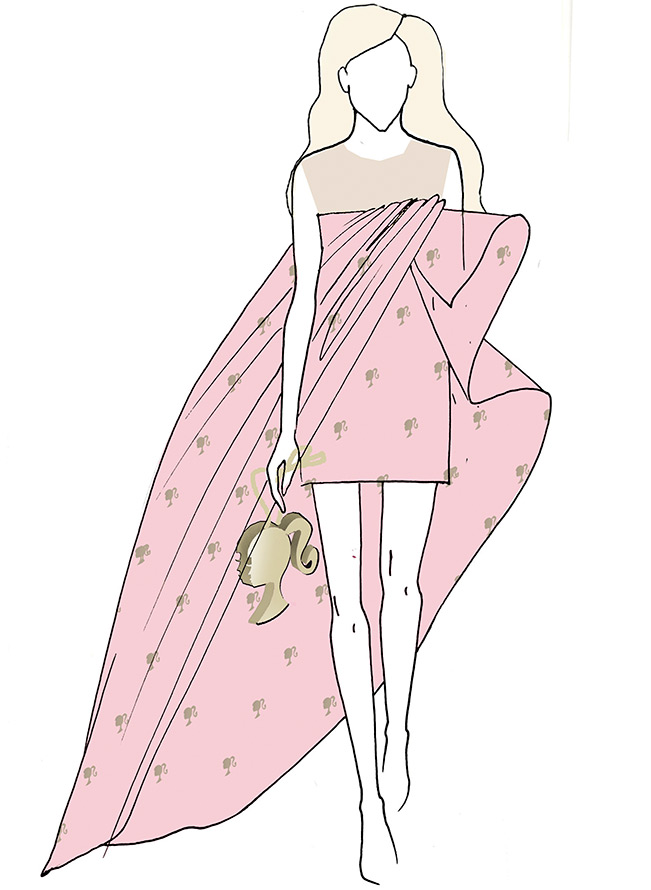 La décoration utilise des éléments décoratifs, des tissus translucides et des broderies exquises, créant une image féminine dans le style reconnaissable de la marque. Certains des produits incluent une interprétation délicate de l'un des symboles emblématiques - le profil Barbie, qui est présent sous la forme d'éléments décoratifs brodés, ainsi que sous la forme de pochettes originales en cuir doré.