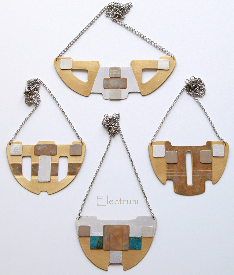 J'aime surtout travailler avec différents types de métaux : cuivre, cupronickel, laiton. J'aime jouer avec les textures, les combiner entre elles. J'aime aussi travailler le plexiglas et, bien sûr, la porcelaine. Quant au type de bijoux, le plus intéressant pour moi est de créer des colliers et des broches.