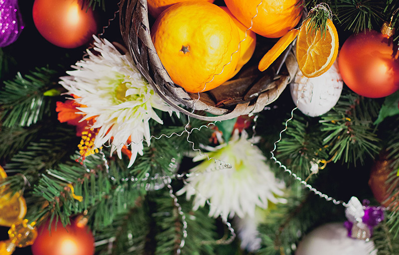 Aussi, le designer conseille d'utiliser des produits comme décor. Ainsi, parmi les décorations d'arbres de Noël, des bonbons peuvent être répertoriés et des mandarines dans un panier en osier deviendront une décoration juteuse d'une table basse dans le salon. Et les fleurs sur les arbres de Noël et dans les compositions du Nouvel An sont déjà au sommet de leur popularité pour la deuxième année. De plus, les fleurs artificielles ne diffèrent souvent pas extérieurement des fleurs naturelles et vous serviront longtemps pour décorer vos vacances.