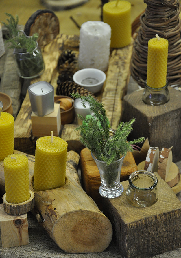 Elena Krylova, auteur de projets éco-style, conseille d'utiliser différents matériaux naturels. Par exemple, abattre des arbres peut devenir une décoration de table, des cônes peuvent faire une guirlande inhabituelle et une vieille boîte en bois en duo avec une couverture tricotée peut devenir une table basse. Les bocaux en verre ont fière allure comme support pour bougies et compositions florales. Attachez un ruban de satin autour du cou pour l'art.