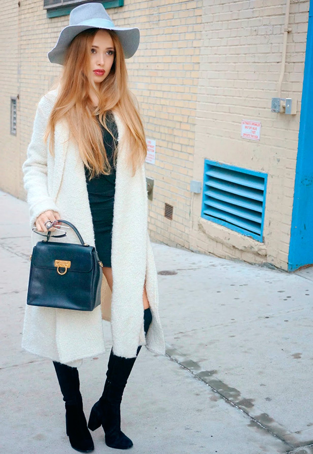De plus, vous pouvez combiner un manteau blanc ou un manteau de fourrure avec des petites robes noires et des collants ou leggings mats. De telles combinaisons conviennent non seulement aux filles, mais aux femmes de plus de 40 ans ...