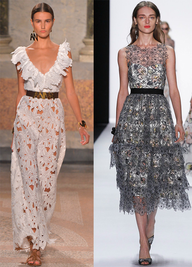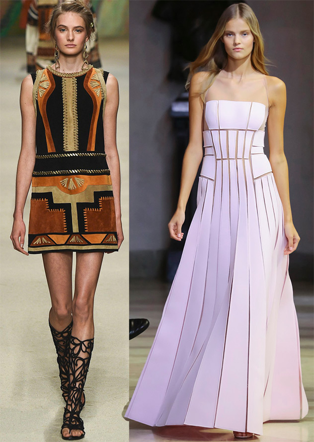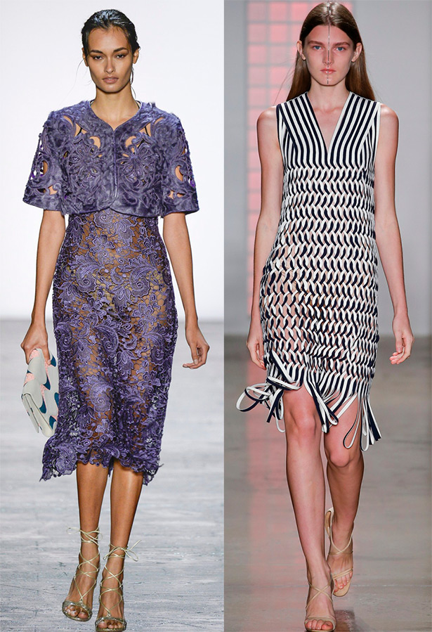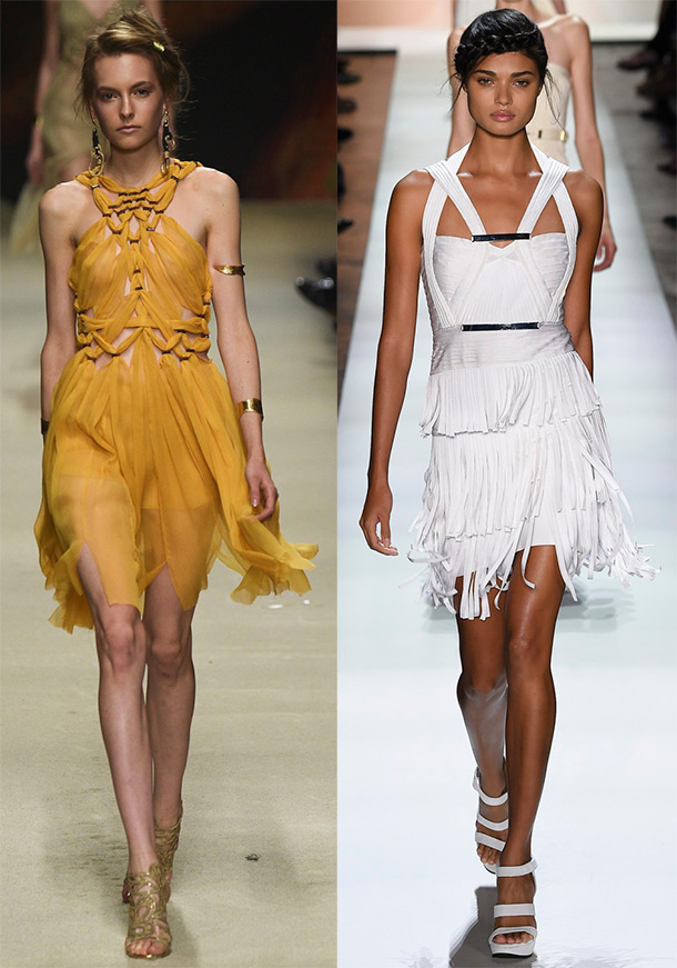 Dans les robes Herve Leger de Max Azria, Balmain, Emanuel Ungaro, un avantage particulier est le tissage sous la forme d'une maille ou d'un bandage à rayures. Et chez Alberta Ferretti, les tissages sont en mousseline.