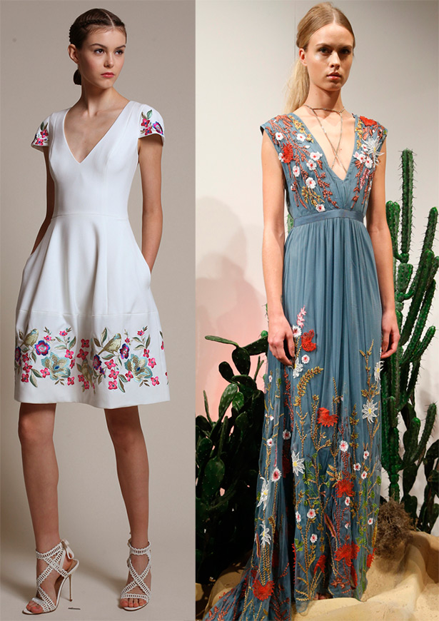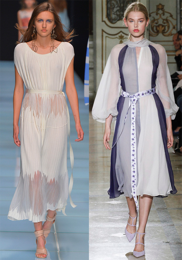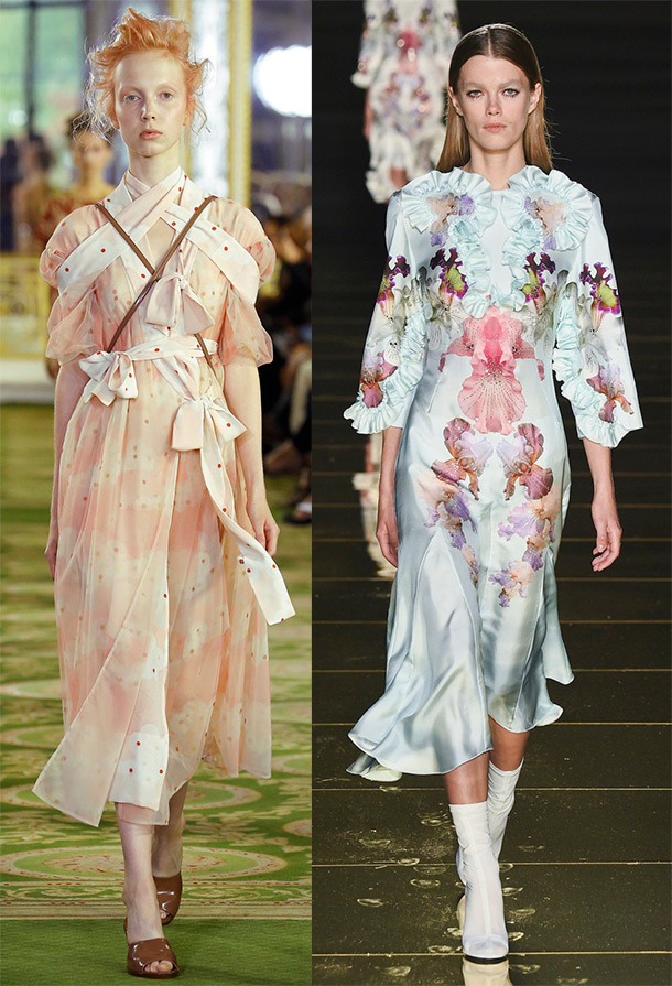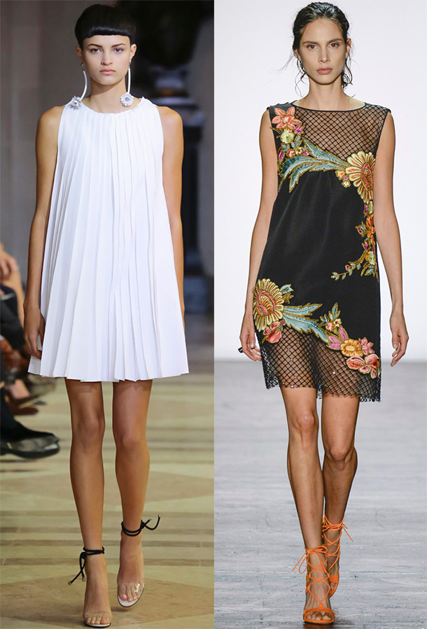 Les fleurs, les volants, les volants, les plis et une palette lumineuse serviront de bon décor pour les robes trapèze. De nombreuses silhouettes A sont réalisées dans le style folklorique national. Il est impossible de ne pas remarquer que la tendance principale de la décoration est devenue les rubans, qui se tordent derrière les silhouettes élancées des modèles ou sont noués avec des nœuds et des nœuds, et parfois la robe est assemblée à partir de rubans séparés.