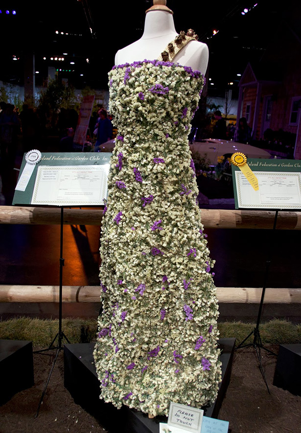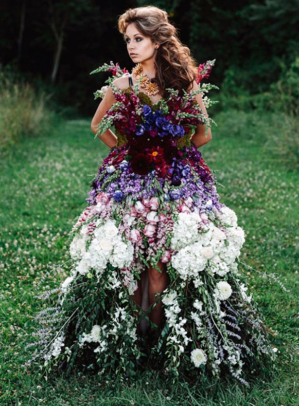 L'utilisation de fleurs entières avec des tiges peut être utilisée pour un véritable tissage floral, mais une robe de mariée à fleurs entières s'avérera très volumineuse et lourde.