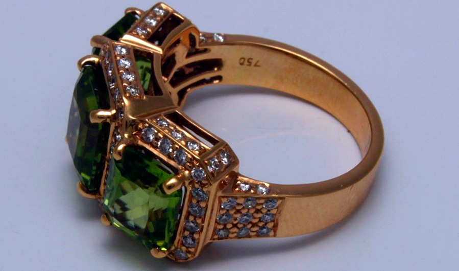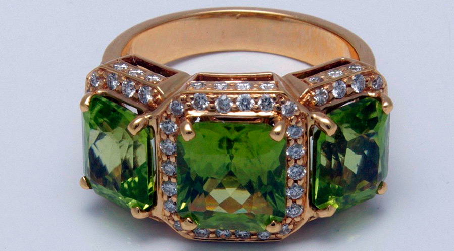 Les bagues avec chrysolite sont extrêmement rares, car la pierre peut être rapidement rayée. La plupart des broches, boucles d'oreilles et colliers sont décorés d'inserts en chrysolite. Les bijoutiers rivalisent constamment avec la nature et créent ainsi des chefs-d'œuvre.
