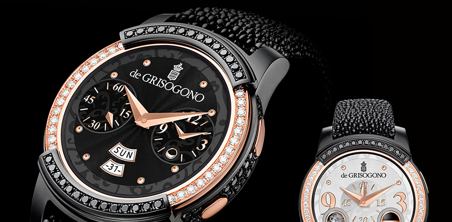 Le boîtier de la montre est en partie en acier noirci, en partie en or rose, la propre ligature de Grisogono. Des diamants étaient alignés autour du cadran - des pierres noires étaient serties en acier et des pierres transparentes en or.