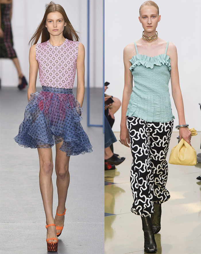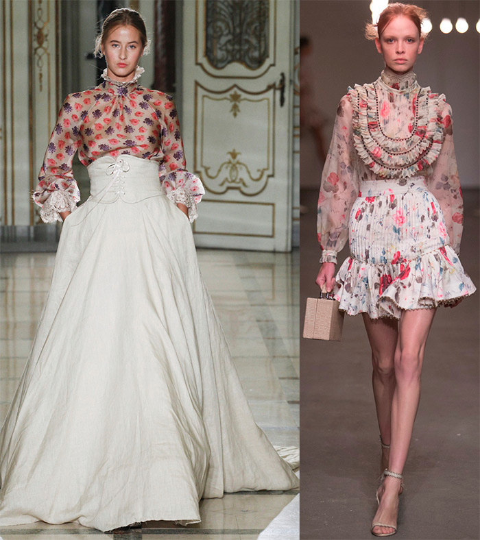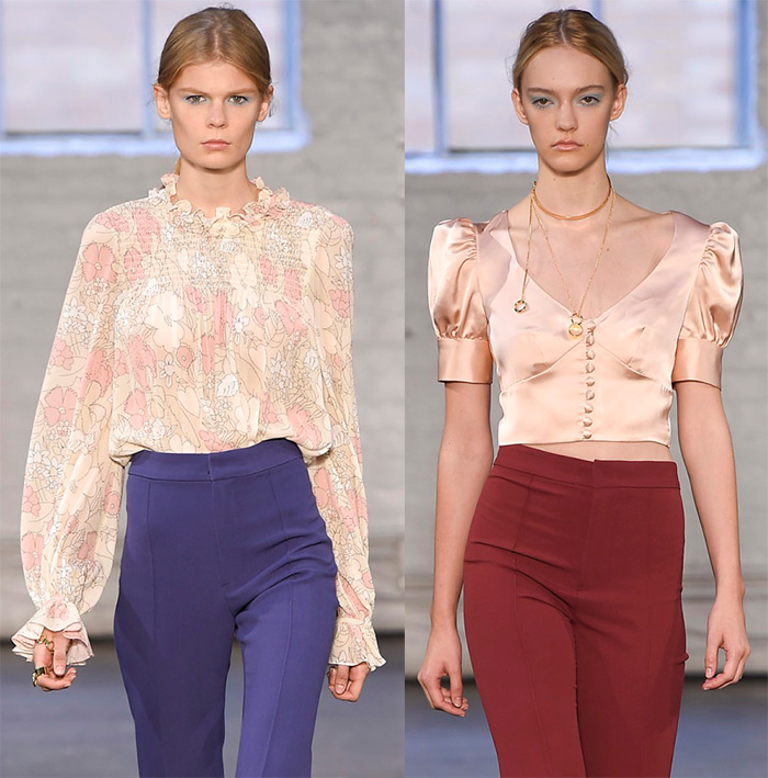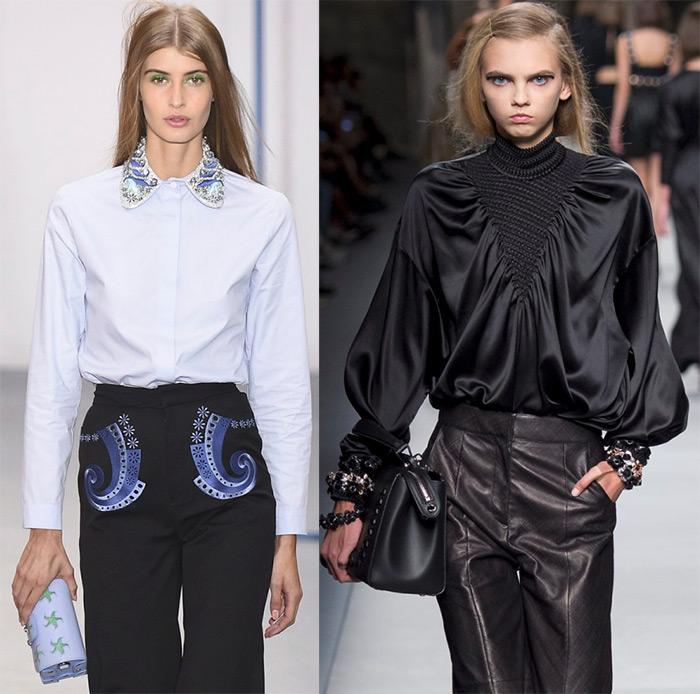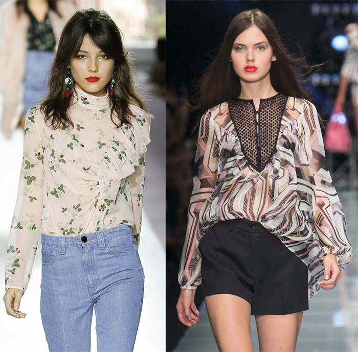 Les éléments décoratifs de la nouvelle saison sont les volants, les volants, les gaufres, les bouffées, les fronces, les cravates, les nœuds, les rubans, les dentelles, les broderies. Dans la tendance, les chemisiers à col montant, complétés par des nœuds ou des cravates, des chemisiers en lin ou avec des broderies en lin.