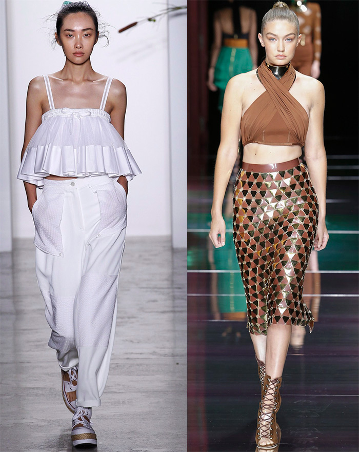 Parmi les nombreux modèles de tops, les créateurs ont choisi : des débardeurs - comme un tee-shirt régulier ou à fines bretelles, dos nu - un top dos nu avec des bretelles de différentes largeurs nouées autour du cou, un top tube - un haut sans bretelles serré, pas plus haut que les aisselles, un corset - un haut qui couvre étroitement la partie inférieure de la poitrine et de l'abdomen, des hauts à volants et épaules nues, des hauts courts et bien d'autres.