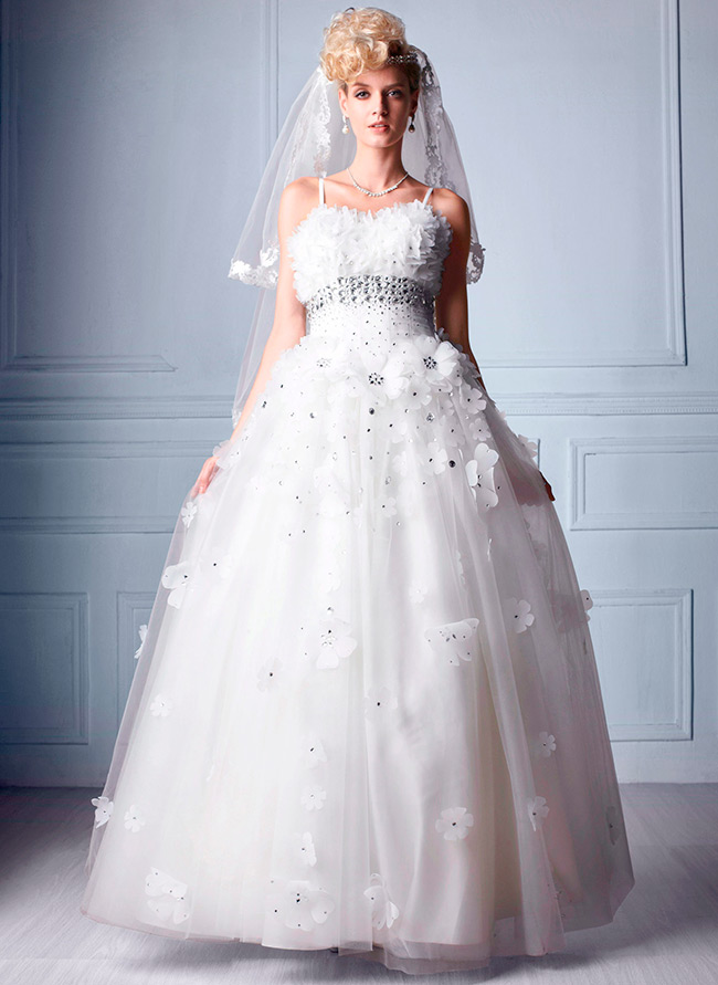 Elles diffèrent en ce que les robes de princesse ont une silhouette en forme de A. Il s'agit d'une robe une pièce avec un corsage étroit et une taille naturelle ou basse qui s'évase vers le bas. Pour garder la jupe moelleuse, des jupons et des motifs spéciaux sont utilisés. Dans le même temps, la robe peut être soit avec un minimum de décor, soit brodée de perles, de perles, de fils d'argent et de strass. Certains modèles peuvent contenir des éléments de draperie et une traîne de différentes longueurs.