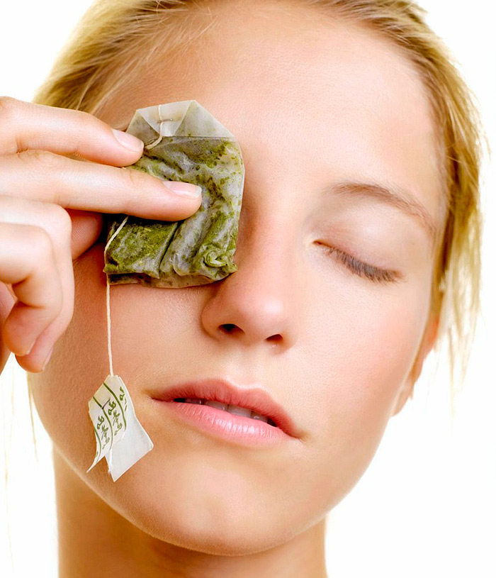 Vous pouvez attacher des sachets de thétrempé dans l'eau. Le thé vert aide à éliminer l'excès de liquide du corps. Lorsqu'il est utilisé par voie topique, il réduit l'enflure et aide à stimuler la circulation.