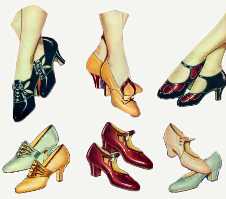 Les chaussures des années 1920 étaient conçues pour la danse, elles n'avaient pas de découpes profondes pour ne pas s'envoler, certains modèles sur le cou-de-pied étaient fermés par un bouton, le talon était de hauteur moyenne. Seules les chaussures les plus élégantes avaient des talons hauts. Les chaussures multicolores étaient populaires. Chaussures d'été - sandales plates à semelles épaisses ou chaussures en cuir lisse. Les chaussures basses étaient portées comme chaussures de sport et les chaussures de soirée étaient en satin avec des boucles et des strass, peintes à la main. En hiver, des bottes en caoutchouc étaient portées sur les chaussures.