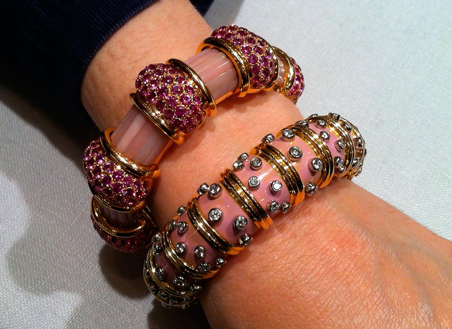 Jean Schlumberger a relancé la technique de l'émail appelée paillonn ?. Depuis plus de 50 ans, les bracelets rouges, bleus et verts sont devenus les principaux accessoires de la garde-robe de toutes les femmes élégantes. On connaît également la broche en forme de deux fraises rubis avec des feuilles de diamant, offerte par John F. Kennedy à son épouse Jackie.