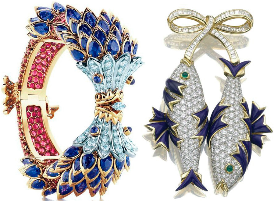 ... Broche en forme de poisson, collier "Etoiles et Lune", scintillant de jets de lumière éclatants, broche "Etoile de mer", bagues Sixteen Stone, qui sont devenues la marque de fabrique de Schlumberger et les plus populaires de l'histoire de Tiffany, bracelets en émail connus aujourd'hui sous le nom de bracelets de Jackie. Jacqueline Kennedy adorait les bijoux Schlumberger, on la voyait souvent avec des bracelets en émail sur les bras.