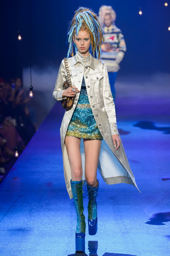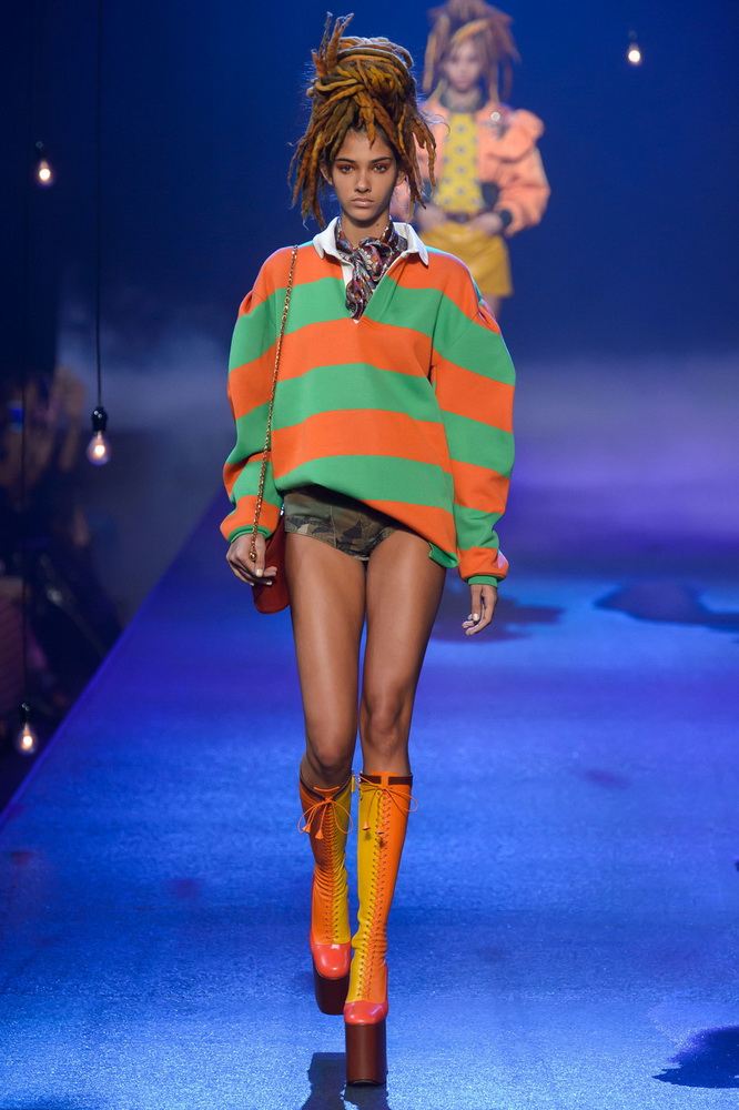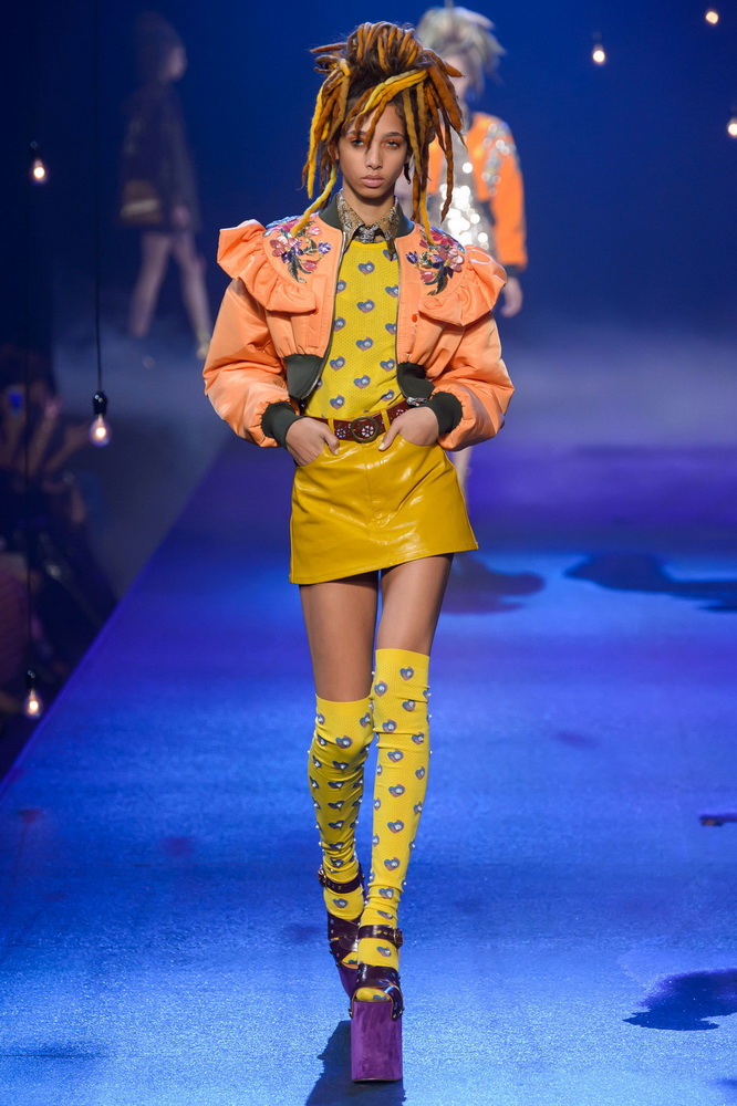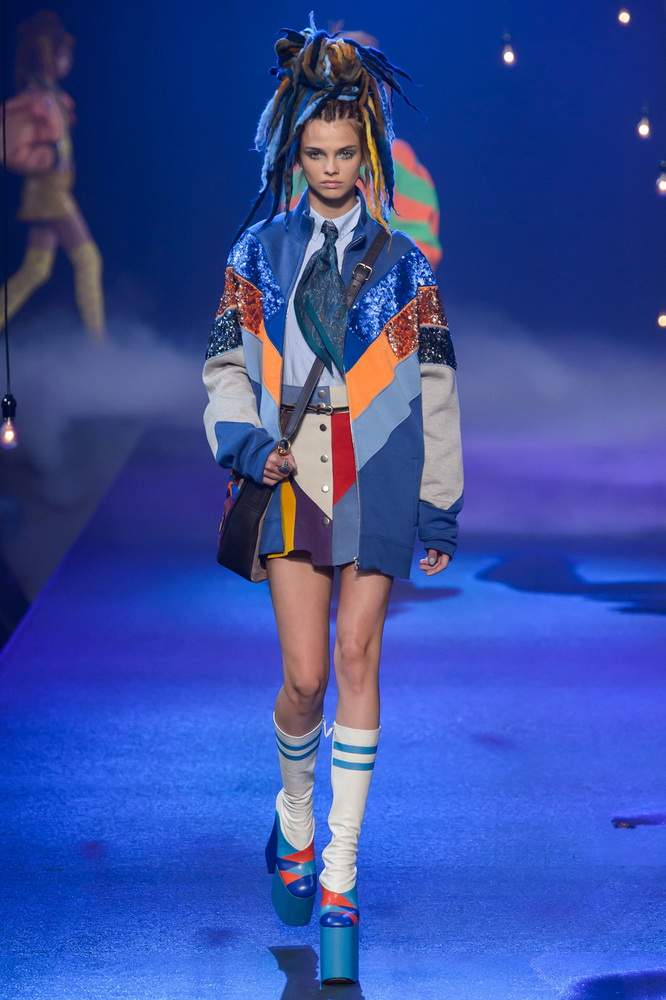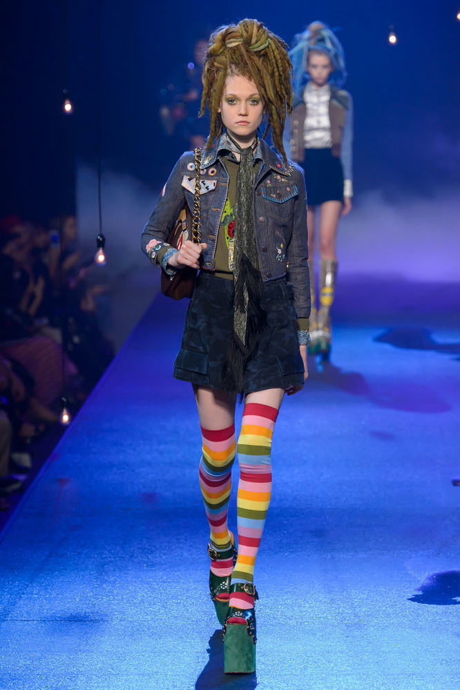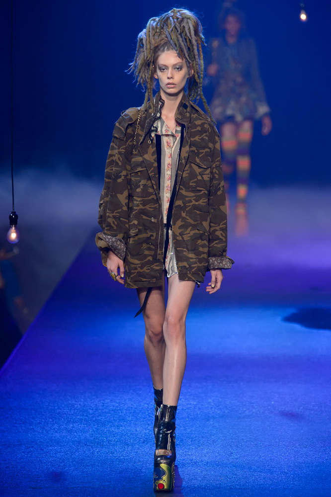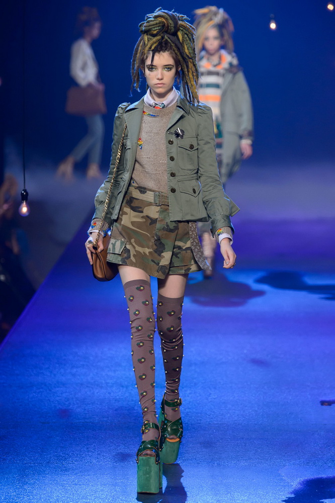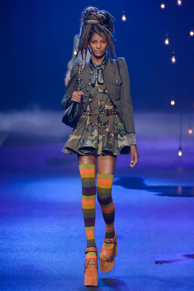 La nouvelle collection Marc Jacobs est très riche et luxueuse, elle a tout - des tenues pour filles informelles, de style militaire, des vêtements pour les fêtes et les clubs. Les mannequins ont défilé sur d'énormes plates-formes, en short et en haut, des vestes en tissus brillants et brillants avec des imprimés intéressants. Partant de teintes pastel délicates et amenant progressivement la couleur des tenues au camouflage et aux couleurs acidulées vives, la créatrice a compilé une collection entièrement de mini silhouettes.