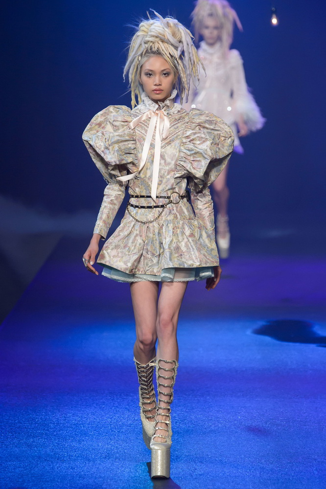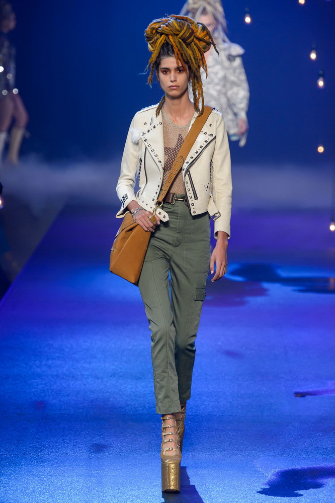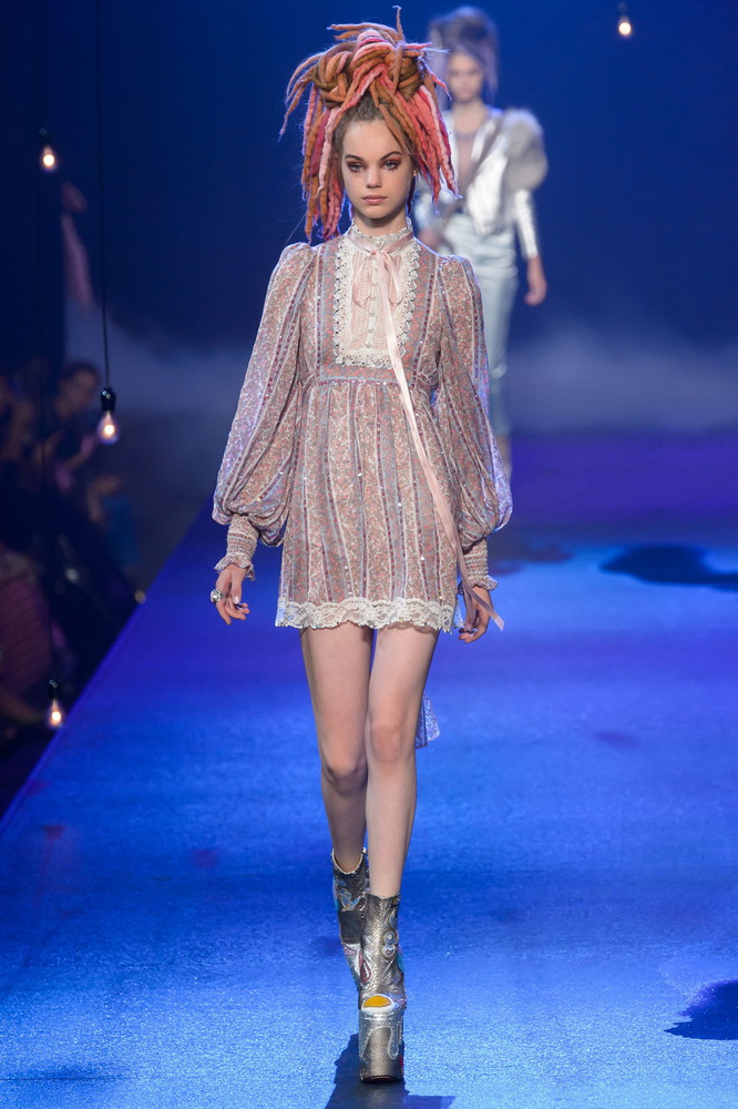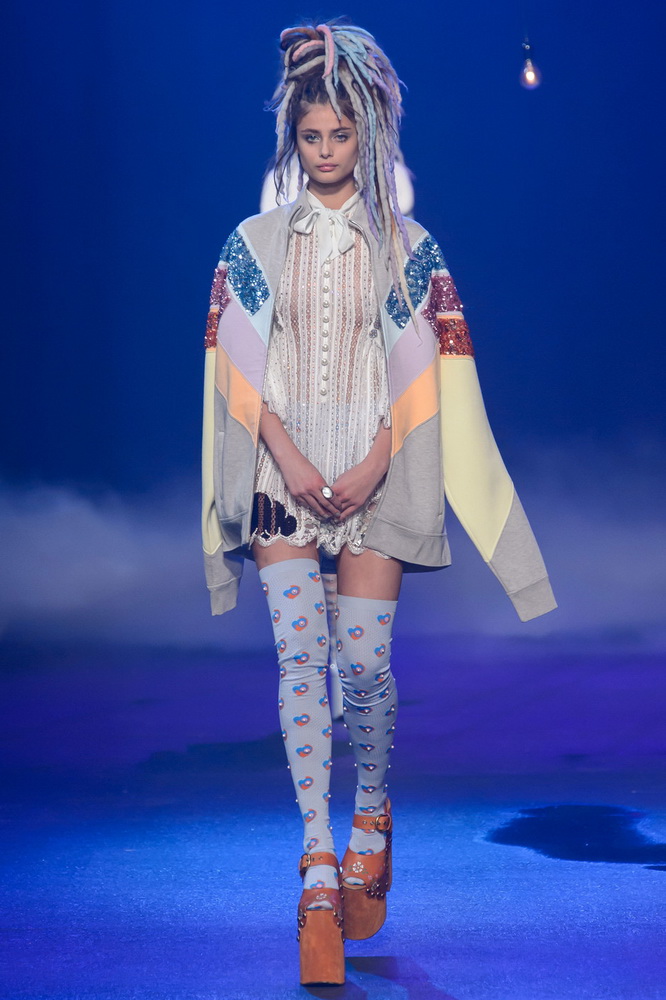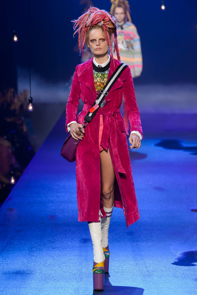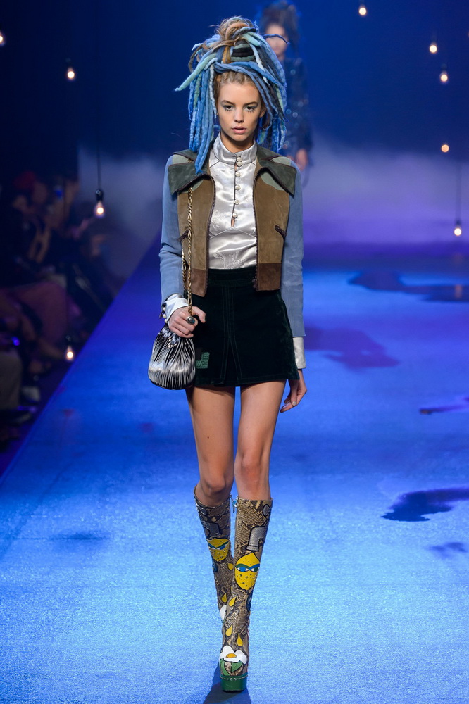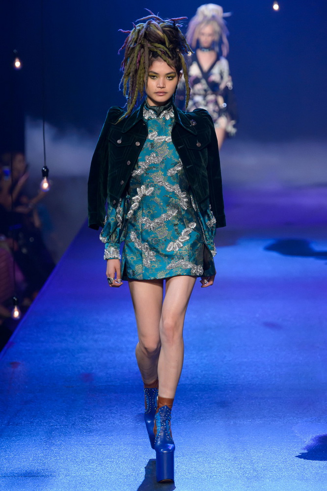 La nouvelle collection Marc Jacobs est très riche et luxueuse, elle a tout - des tenues pour filles informelles, de style militaire, des vêtements pour les fêtes et les clubs. Les mannequins ont défilé sur d'énormes plates-formes, en short et en haut, des vestes en tissus brillants et brillants avec des imprimés intéressants. Partant de teintes pastel délicates et amenant progressivement la couleur des tenues au camouflage et aux couleurs acidulées vives, la créatrice a compilé une collection entièrement de mini silhouettes.