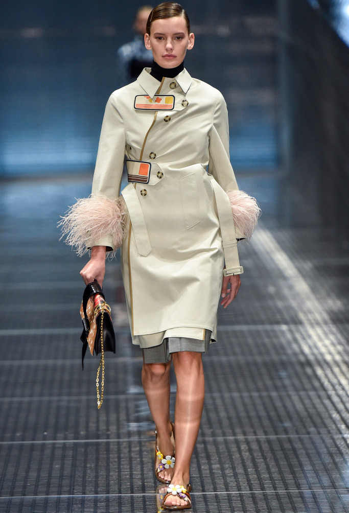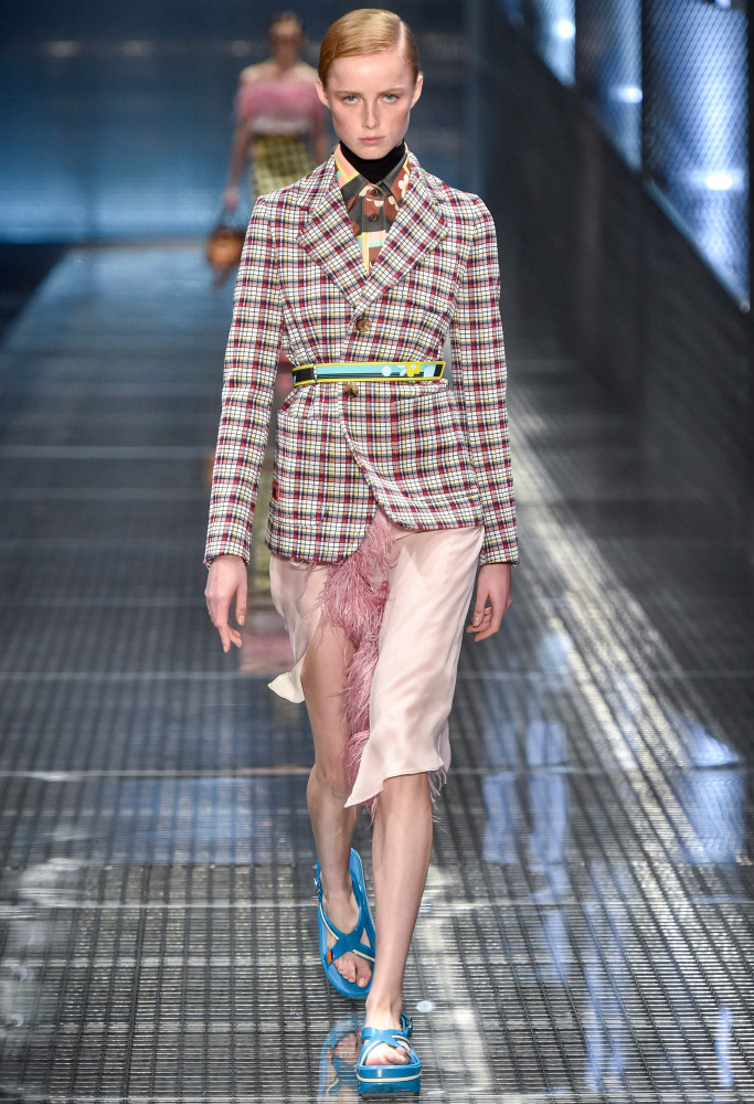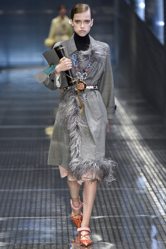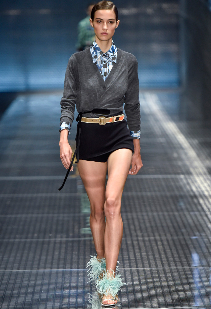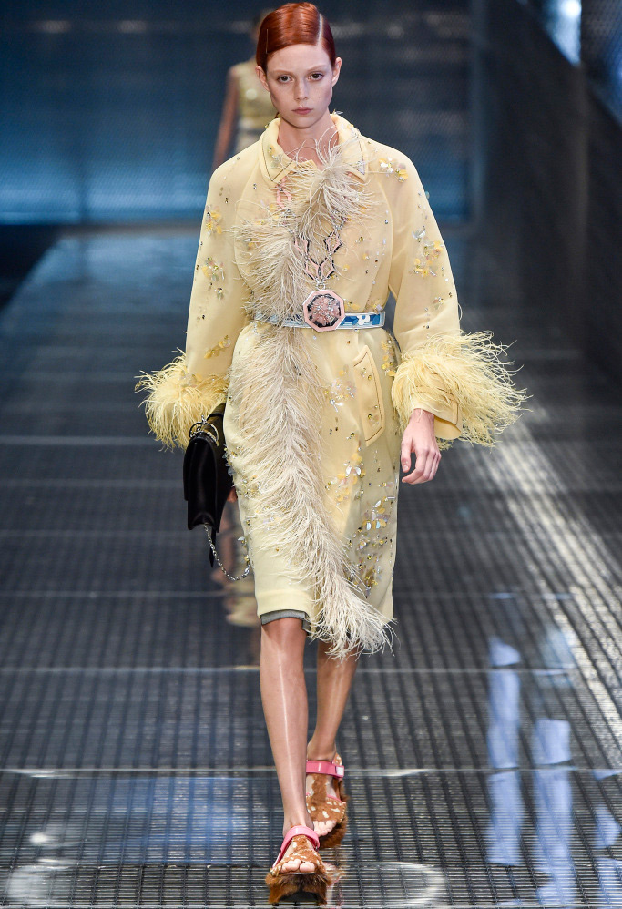 Dans la collection printemps-été 2026 de Prada, le décor le plus marquant est celui des plumes de marabout. Accessoires, manchettes, jupes et même sandales sont ornés de plumes. En second lieu, vous pouvez mettre de l'asymétrie, dans la collection il y a beaucoup de jupes portefeuille asymétriques originales qui sont combinées avec des cols roulés en maille fine, des chemises et des pulls.