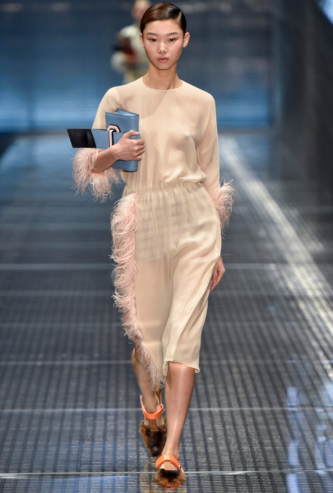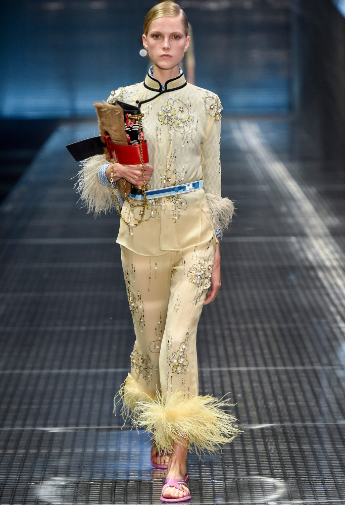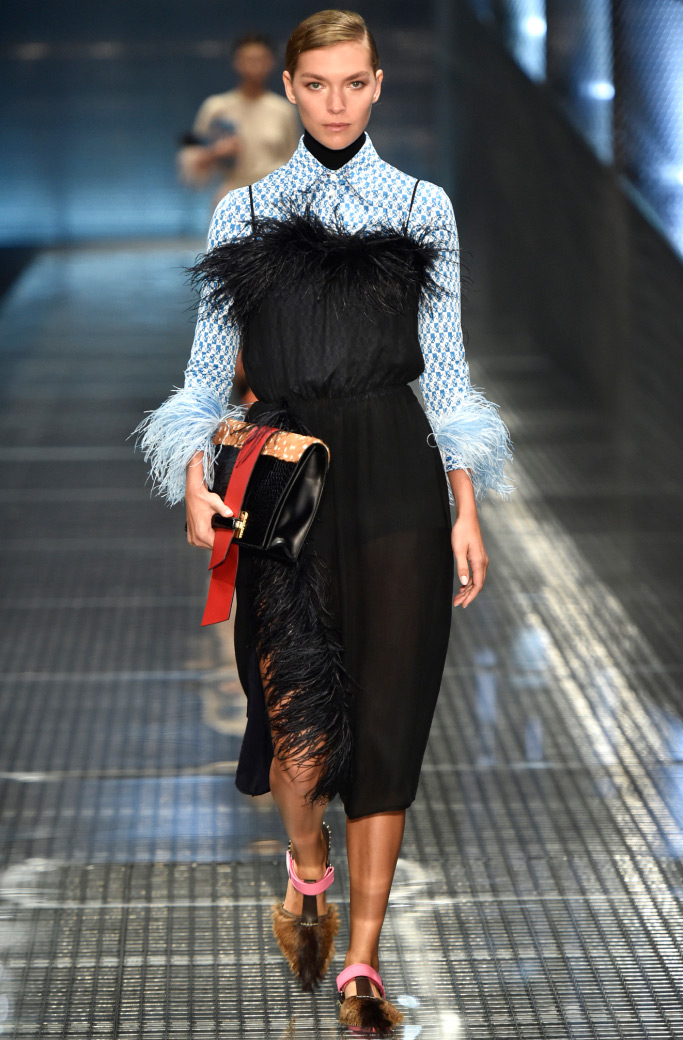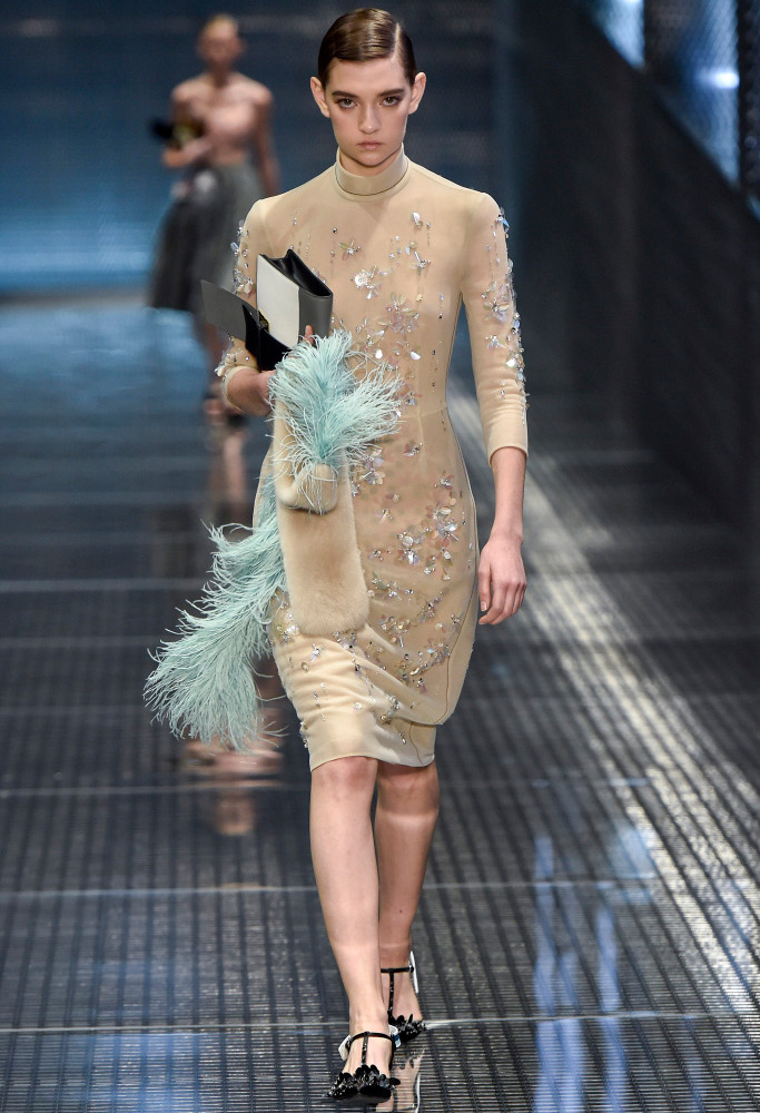 Dans la collection printemps-été 2026 de Prada, le décor le plus marquant est celui des plumes de marabout. Accessoires, manchettes, jupes et même sandales sont ornés de plumes. En second lieu, vous pouvez mettre de l'asymétrie, dans la collection il y a beaucoup de jupes portefeuille asymétriques originales qui sont combinées avec des cols roulés en maille fine, des chemises et des pulls.