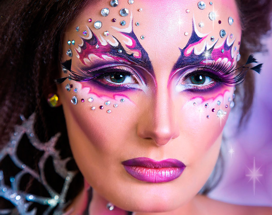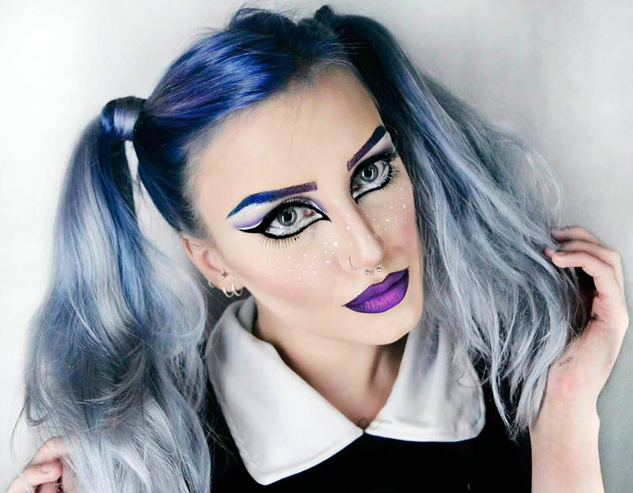 Utilisez du rouge à lèvres violet, des couleurs vives de fard à paupières, des paillettes et créez un magnifique maquillage Halloween 2026 dans le style des séances photo les plus glamour.