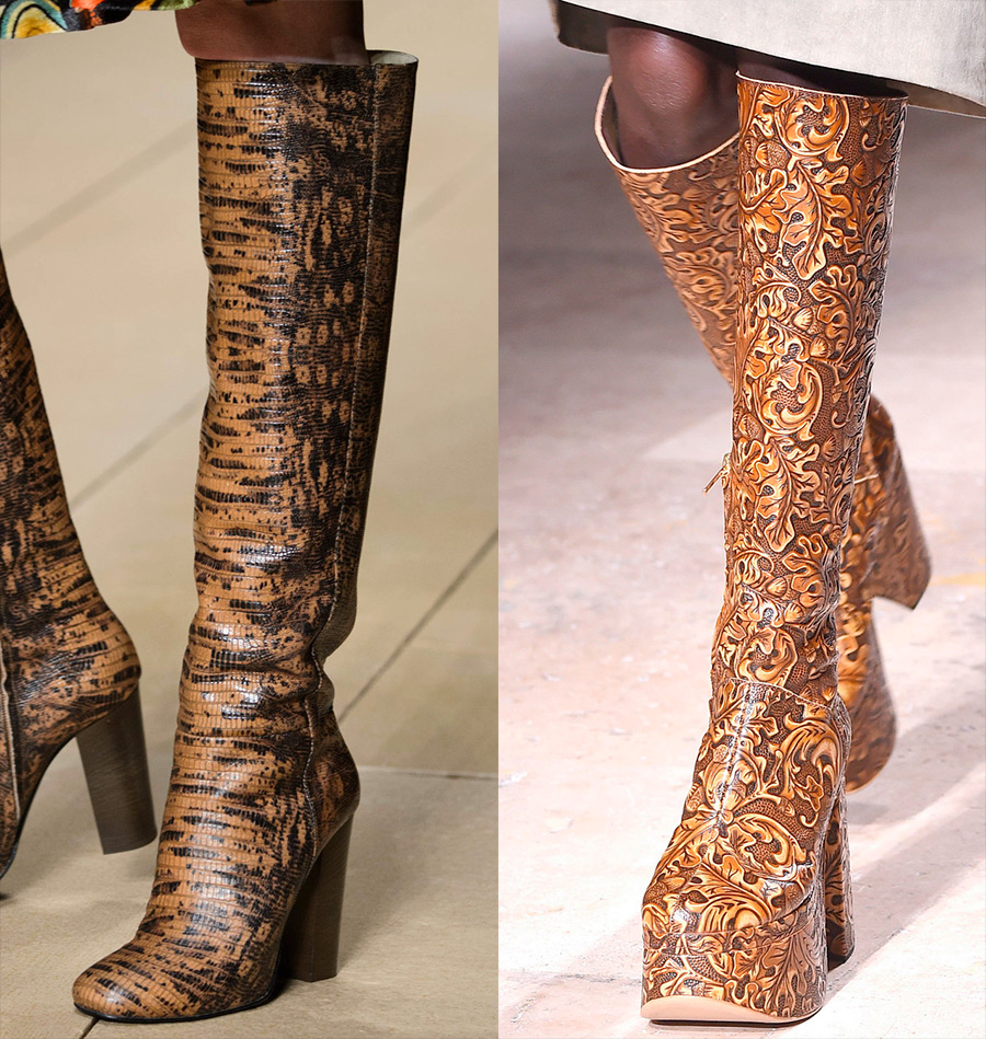 Dans les collections de mode 2025-2026, les bottes en imitation peau de reptile ou en véritable peau de python sont extrêmement populaires. Les modèles bicolores et métallisés ne sont pas moins pertinents. Dans la nouvelle saison, les bottes combinées à partir de différents matériaux et textures ont gagné en popularité.