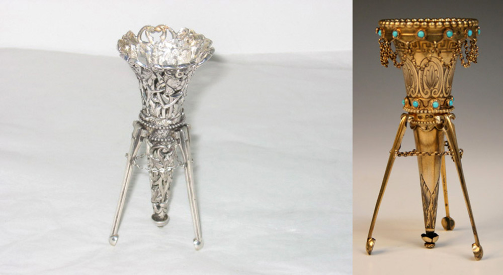 Les port-bouquets les plus complexes dans la conception avaient des pieds qui leur permettaient de se transformer en petits vases à fleurs.