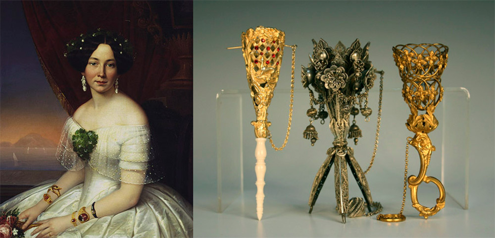 Plus tard, au XIXe et au début du XXe siècle, ils sont devenus un accessoire de mode pour les filles. Les fleurs présentées par le monsieur étaient rassemblées en bouquet et présentées en cas de cour. Il peut être porté comme une châtelaine - à la taille, sur un corsage ou simplement sur un anneau ou une chaîne porté au bras.