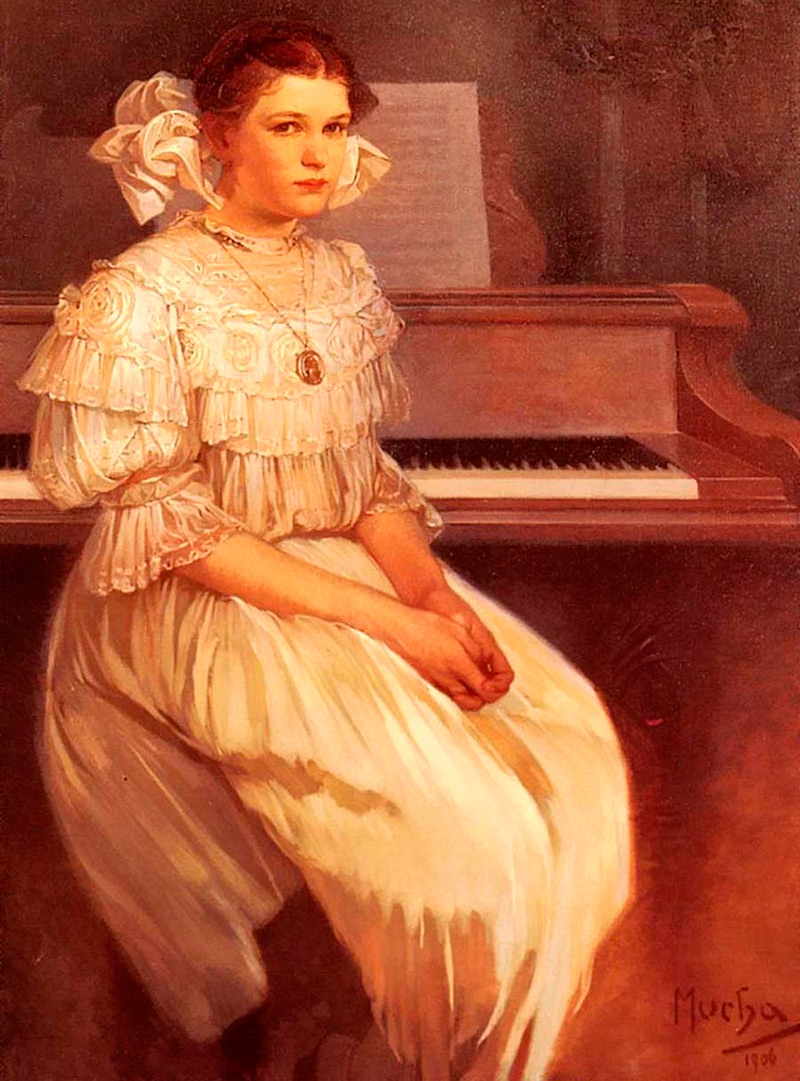Depuis l'enfance, Alphonse Mucha aimait dessiner, mais sa tentative d'entrer à l'Académie des Arts de Prague a échoué. Dès lors, il débute sa carrière comme décorateur, artiste d'affiches et cartons d'invitation. Il n'a pas non plus refusé de peindre les murs et les plafonds des riches maisons.