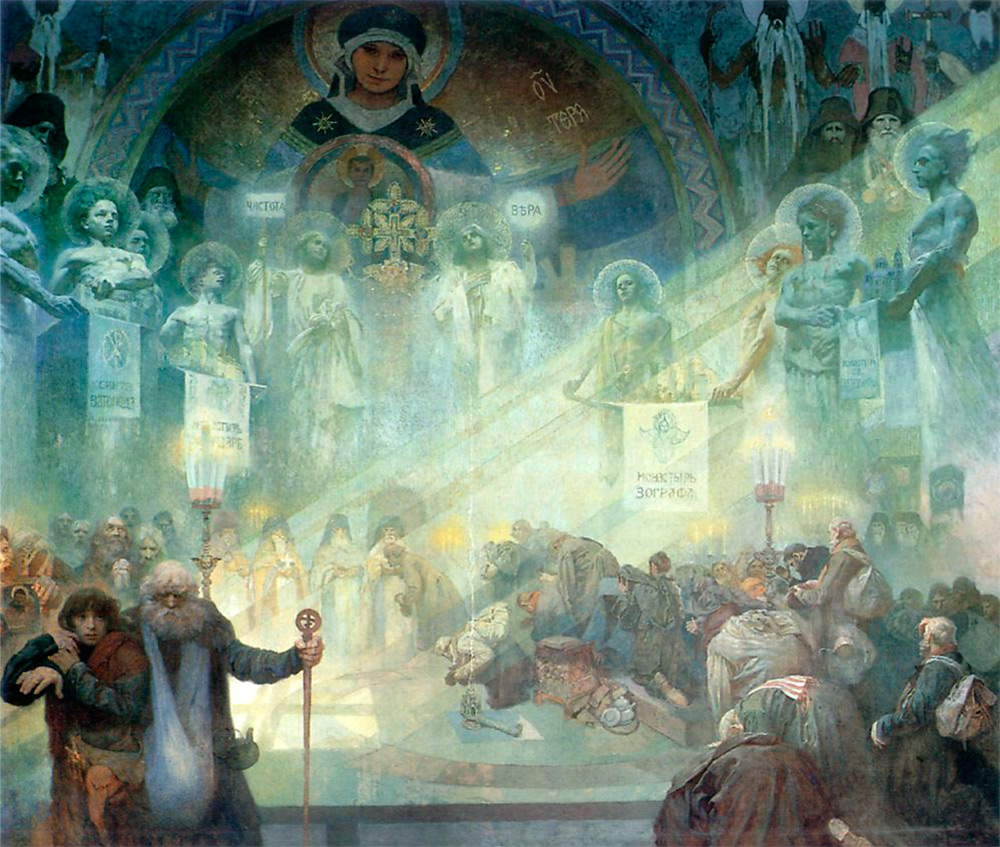En 1906, Alphonse Mucha part en Amérique pour gagner l'argent nécessaire à la réalisation du rêve de toute sa vie créative : créer des tableaux pour la gloire de sa patrie et de tous les Slaves.