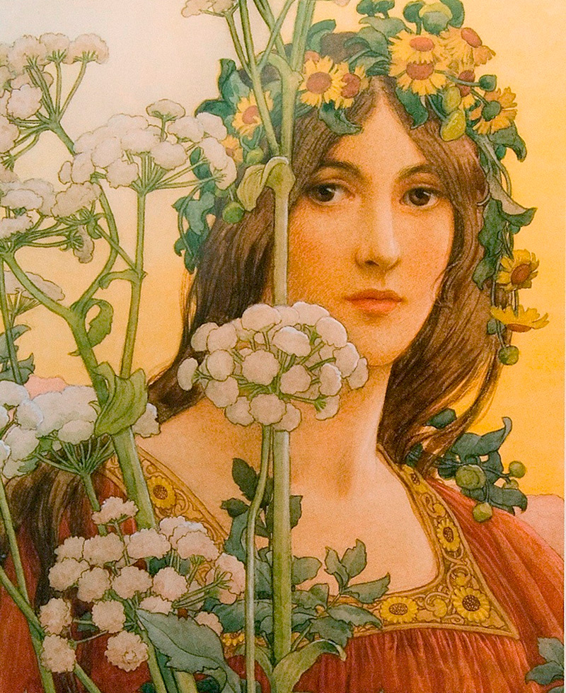 Le centre de la composition, en règle générale, est une jeune femme en bonne santé d'apparence slave vêtue de vêtements amples, avec une luxueuse couronne de cheveux, se noyant dans une mer de fleurs - parfois langoureusement captivante, parfois mystérieuse, parfois gracieuse, parfois inaccessible fatale, mais toujours charmante et jolie.