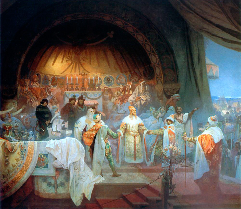 De nombreuses décorations basées sur les croquis de Mucha ont été réalisées pour la mariée, puis pour la femme de l'artiste, Maria Khitilova, que l'artiste et ses amis appelaient Marushka. Khitilova était une compatriote de Mucha. Ils se sont mariés en 1903 et ont vécu ensemble toute leur vie.