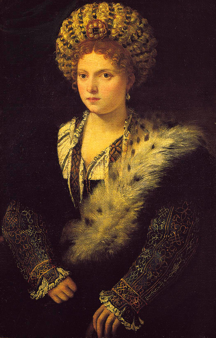 Surtout la mode pour les cheveux blonds se répandra à Venise. Les Vénitiens portaient même des chapeaux de paille sans fond, dans lesquels leurs cheveux étaient disposés sur le bord afin de brûler au soleil, ils acquièrent une teinte plus claire.